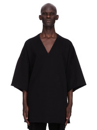 RICK OWENS FW25 CONCORDIANS V TOMMY T IN BLACK COMPACT TERRY JERSEY THIS V TOMMY T IS BELOW HIP LENGTH WITH A JUMBO OVERSIZED FIT. IT HAS WIDE SHORT SLEEVES WITH A DROPPED ARMHOLE, RAW CUT HEMS AND A V NECK. IT FEATURES SIGNATURE FRONT LEVEL SHOULDER SEAMS THIS HEAVYWEIGHT AND COMPACT TERRY JERSEY HAS A DRY, TEXTURED FACE SIDE AND A SOFT, BRUSHED INSIDE THIS JERSEY IS MADE USING GOTS CERTIFIED ORGANIC COTTON WHICH MEANS THE NATURAL FIBER IS GROWN WITHOUT HARMFUL CHEMICALS, LEAVING OUR SOIL, AIR AND WATER CLEANER FROM CONTAMINATES COLOR: BLACK MATERIAL: 100% COTTON MODEL IS 189CM TALL ITEM IS AVAILABLE IN ONE SIZE