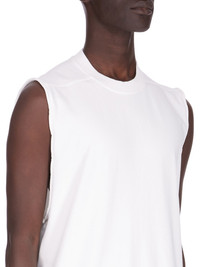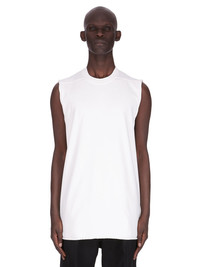 RICK OWENS FW25 CONCORDIANS RUNWAY JUMBO SL T IN MILK COMPACT HEAVY JERSEY THIS JUMBO SL T IS BELOW HIP LENGTH WITH AN OVERSIZED FIT AND SLEEVELESS. IT HAS A RIBBED CREWNECK AND IT FEATURES SIGNATURE FRONT LEVEL SHOULDER SEAMS AND A CENTRE BACK SEAM THIS HEAVYWEIGHT AND COMPACT COTTON JERSEY HAS A BRUSHED AND SOFT HANDFEEL. THIS JERSEY IS GARMENT DYED THIS FABRIC IS MADE USING GOTS CERTIFIED ORGANIC COTTON WHICH MEANS THE NATURAL FIBER IS GROWN WITHOUT HARMFUL CHEMICALS, LEAVING OUR SOIL, AIR AND WATER CLEANER FROM CONTAMINATES COLOR: MILK MATERIAL: 100% COTTON MODEL IS 189CM TALL MODEL WEARS SIZE S