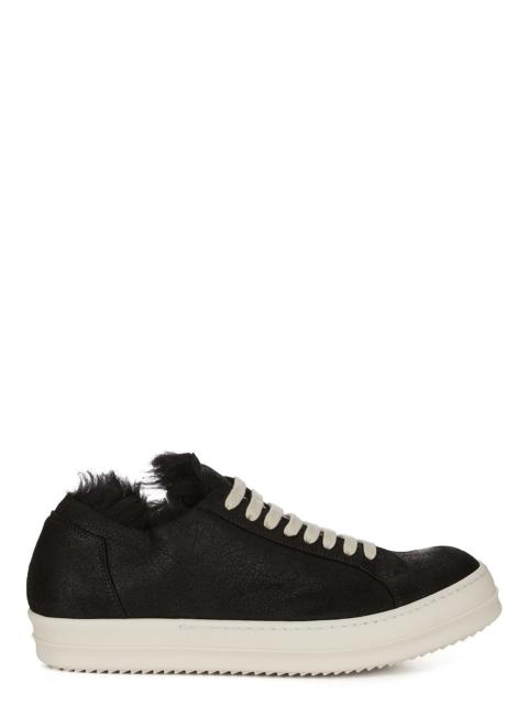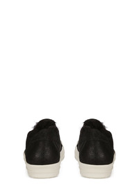 RICK OWENS FW25 CONCORDIANS MINIMAL VINTAGE SNEAKS IN BLACK/MILK CURLY SHEARLING THESE MINIMAL VINTAGE SNEAKS ARE UNDER-ANKLE HEIGHT AND HAVE EIGHT EYELETS WITH LACES, TOE CAPS AND SHARK-TOOTHED BUMPER SOLES. THEY FEATURE A PADDED ANKLE. THIS OUR CURLY SHEARLING VERSION THIS HEAVYWEIGHT SHEARLING LAMB LEATHER HAS A WAXY NAPPA FINISH AND A SOFT NATURAL FUR TANNED IN THE TUSCANY AREA OF ITALY, THESE SHEARLING MERINO HIDES ARE OF SPANISH ORIGIN, THE UNIQUE THICK FUR OF THESE ANIMALS MAKE THEM PERFECT FOR SHEARLING. BECAUSE THE HAIR IS NATURAL, THERE WILL BE VARIATIONS IN HAIR LENGTH AND TEXTURE, MAKING EACH PIECE UNIQUE THIS TANNERY IS LWG CERTIFIED WITH A SILVER RATING COLOR: BLACK/MILK MATERIAL: UPPER 100% LAMB SHEARLING REAL FUR INSOLE 100% CALF LEATHER SOLE 100% THERMOPLASTIC RUBBER SOLE HEIGHT 3.5CM