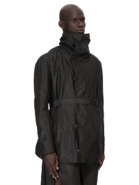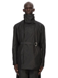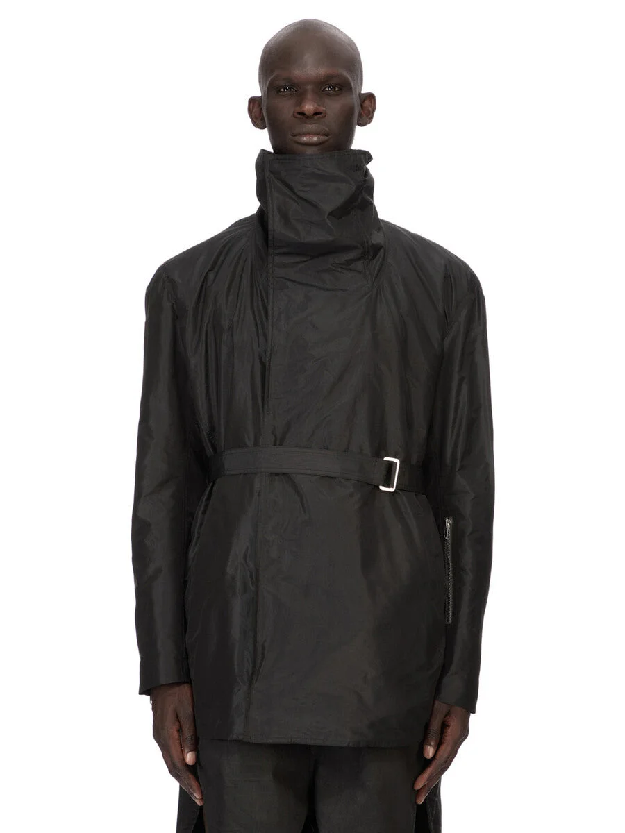 RICK OWENS SS26 TEMPLE DRACUCABAN IN BLACK SILK TAFFETA THIS DRACUCABAN IS BELOW HIP LENGTH AND HAS LONG SLEEVES. IT HAS WIDE SHOULDERS AND SLEEVES, AN OFF-CENTER DOUBLE BREASTED SNAP FRONT WITH A HIGH DRACUCOLLAR. IT HAS SIDE FRONT ZIPPERED POCKETS, ZIPPERED WRISTS, A LEFT FOREARM ZIPPERED POCKET AND A HORIZONTAL ZIPPERED POCKET ON THE LEFT CHEST. IT FEATURES A BELT AND BUCKLE, BELT LOOPS, AND A SLIGHT FOLDED FLAP ON THE BACK LEFT SHOULDER. IT IS FULLY LINED AND HAS INTERNAL ZIPPERED POCKETS. THIS LIGHTWEIGHT AND COMPACT SILK TAFFETAS HAS A CRISP HANDFEEL. IT IS WOVEN IN THE COMO REGION OF ITALY KNOWN FOR ITS HERITAGE OF SILK PRODUCTION. COLOR: BLACK MATERIAL: 100% SILK BODY AND POCKETS LINING 100% COTTON SLEEVES LINING 100% CUPRO MODEL IS 189CM TALL ITEM IS AVAILABLE IN ONE SIZE