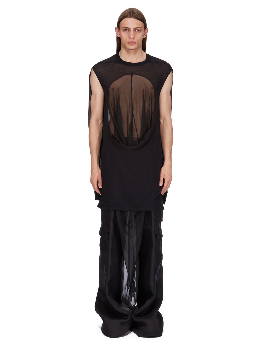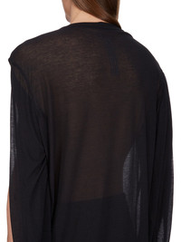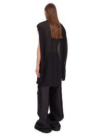 RICK OWENS SS25 HOLLYWOOD DRAIN T IN BLACK/BLACK UNSTABLE COTTON AND SILK CHIFFON THIS DRAIN T IS MID-THIGH LENGTH. IT HAS A ROUND RIBBED CREWNECK, AND LONG CAPE SLEEVES, WITH OPENINGS AT THE FRONT ARMHOLE, SO ARMS CAN BE WORN IN OR OUT. IT FEATURES A LARGE ROUND SEAM ON THE CENTER FRONT BODY WITH A PANEL THAT DRAPES DOWNWARDS INSIDE LIKE A DRAIN, AND FALLS OUT BELOW THE HEM, FINISHING AT ANKLE LENGTH. IT HAS RIB CUFFS, SIGNATURE LEVEL SHOULDER SEAMS, AND SEAM DOWN THE CENTER BACK SPINE THIS IS A COMBINATION OF UNSTABLE COTTON AND SILK CHIFFON. THIS LIGHTWEIGHT COTTON JERSEY IS SEMI-TRANSPARENT WITH A SOFT HANDFEEL. THIS JERSEY IS MADE USING GOTS CERTIFIED ORGANIC COTTON WHICH MEANS THE NATURAL FIBER IS GROWN WITHOUT HARMFUL CHEMICALS, LEAVING OUR SOIL, AIR AND WATER CLEANER FROM CONTAMINATES WE STRIVE TO KEEP OUR PRODUCTION AS LOCAL AS POSSIBLE. THE FULL MANUFACTURING CYCLE OF THIS PRODUCT, FROM THE MATERIAL KNITTING TO SEWING AND FINISHING, WAS UNDERTAKEN CLOSE TO OUR HOME BASE IN CONCORDIA, ITALY COLOR: BLACK/BLACK MATERIAL: 100% COTTON FRONT DETAIL 100% SILK MODEL IS 189CM TALL MODEL WEARS SIZE 48