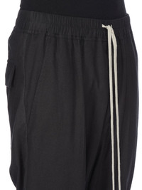 RICK OWENS FW25 CONCORDIANS DRAWSTRING LONG IN BLACK WOOL FLANNEL THESE DRAWSTRING LONG PANTS ARE FULL LENGTH WITH A DROPPED CROTCH. THEY HAVE AN ELASTICIZED WAISTBAND WITH DRAWSTRING, A CONCEALED FLY, AND CREASES IN THE FRONT AND BACK LEG. THEY FEATURE TWO SIDE FRONT POCKETS AND TWO SQUARE BACK POCKETS WITH FLAPS AND TOPSTITCHING THIS LIGHTWEIGHT WOOL AND COTTON BLEND FLANNEL HAS A SOFT AND BRUSHED HANDFEEL THIS FABRIC IS MADE USING GOTS CERTIFIED ORGANIC COTTON AND RWS CERTIFIED WOOL COLOR: BLACK MATERIAL: 81% COTTON + 19% WOOL MODEL IS 181CM TALL MODEL WEARS SIZE 40