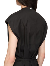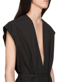 RICK OWENS SS26 TEMPLE SL SHORT JUMPSUIT IN BLACK HEAVY POPLIN THIS SL SHORT JUMPSUIT IS KNEE LENGTH AT FRONT AND SLIGHTLY LONGER IN THE BACK AND HAS SHORT, CAP, SLEEVES. IT FEATURES A DEEP, DYLAN V FRONT, A THIN BELT AND BELT LOOPS, TOP SNAP CLOSURE ON BACK OF NECK, BEVELED SIDES AND SIDE SEAM POCKETS THIS MEDIUMWEIGHT COTTON POPLIN HAS A CRISP HANDFEEL AND WASHED FINISH THIS FABRIC IS MADE USING GOTS CERTIFIED ORGANIC COTTON WHICH MEANS THE NATURAL FIBRE IS GROWN WITHOUT HARMFUL CHEMICALS, LEAVING OUR SOIL, AIR AND WATER CLEANER FROM CONTAMINATES COLOR: BLACK MATERIAL: 97% COTTON + 3% ELASTANE MODEL IS 189CM TALL MODEL WEARS SIZE 48