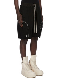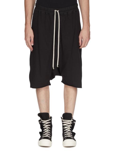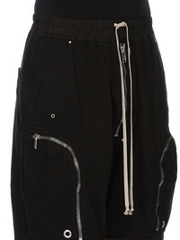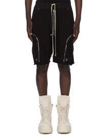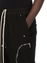 DRKSHDW SS26 TEMPLE BAUHAUS PODS IN BLACK COMPACT HEAVY JERSEY THESE BAUHAUS PODS ARE KNEE-LENGTH WITH A LOW DROPPED CROTCH. THEY HAVE AN ELASTICIZED WAISTBAND WITH DRAWSTRING AND SIDE POCKETS. THEY FEATURE SIGNATURE ROUND BAUHAUS POCKETS WITH ZIPPERS, WEBBING TAB AND EYELET DETAIL ON THE FRONT THIGH. THEY HAVE BACK FLAP POCKETS WITH SNAPS. THIS HEAVYWEIGHT AND COMPACT COTTON JERSEY HAS A BRUSHED AND SOFT HANDFEEL. THIS JERSEY IS GARMENT DYED. THIS FABRIC IS MADE USING GOTS CERTIFIED ORGANIC COTTON WHICH MEANS THE NATURAL FIBER IS GROWN WITHOUT HARMFUL CHEMICALS, LEAVING OUR SOIL, AIR AND WATER CLEANER FROM CONTAMINATES. COLOR: BLACK MATERIAL:100% COTTON BAND 97% COTTON + 3% ELASTANE MODEL IS 189CM TALL MODEL WEARS SIZE S