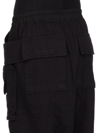 DRKSHDW FW25 CONCORDIANS CREATCH CARGO PODS IN BLACK COMPACT HEAVY JERSEY THESE CREATCH CARGO PODS. ARE BELOW KNEE LENGTH, WITH A DROPPED CROTCH AND WIDE CENTRE PANEL. THEY HAVE AN ELASTICIZED WAISTBAND WITH DRAWSTRING AND STITCHED FLY. THEY FEATURE LAYERED FRONT POCKETS WITH SIDE BELT STRAPS WITH SIGNATURE STITCHING LINES AND TWO FLAP POCKETS WITH FLAPS AND TOPSTITCHING. THIS HEAVYWEIGHT AND COMPACT COTTON JERSEY HAS A BRUSHED AND SOFT HANDFEEL. THIS JERSEY IS GARMENT DYED THIS FABRIC IS MADE USING GOTS CERTIFIED ORGANIC COTTON WHICH MEANS THE NATURAL FIBER IS GROWN WITHOUT HARMFUL CHEMICALS, LEAVING OUR SOIL, AIR AND WATER CLEANER FROM CONTAMINATES COLOR: BLACK MATERIAL: 100% COTTONBAND 97% COTTON + 3% ELASTANE MODEL IS 189CM TALL MODEL WEARS SIZE S