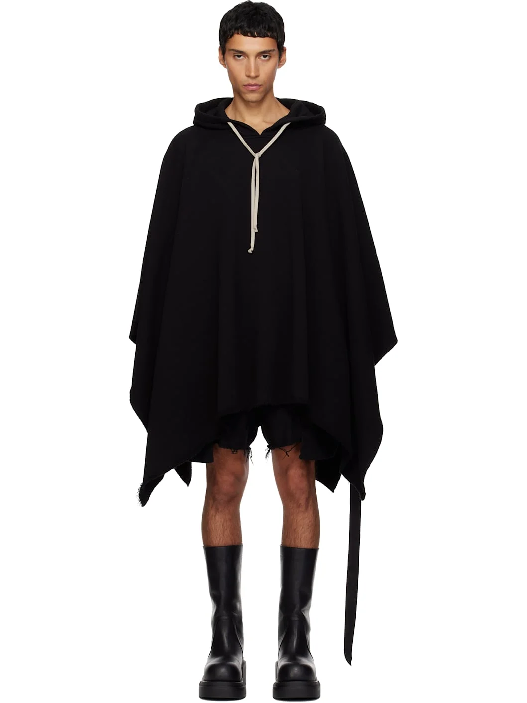Organic cotton fleece poncho-style hoodie. · Drawstring at hood · Raw-edge at handkerchief hem · Integrated logo-woven strap at interior Supplier color: Black 100% cotton. Made in Italy 252126M202012