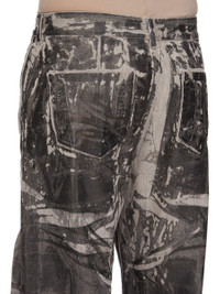 DRKSHDW FW25 CONCORDIANS GETH JEANS IN 13OZ WASHED FOIL DENIM THESE GETH JEANS ARE A FULL LENGTH, 5-POCKET JEAN WITH A MID-RISE AND WIDE FIT. THEY HAVE A CONCEALED ZIPPER FLY WITH TOP BUTTON, A WAISTBAND WITH BELT LOOPS AND POCKET RIVETS. THEY HAVE REAR PATCH POCKETS AND TOPSTITCHING. THIS MEDIUMWEIGHT WASHED FOIL DENIM IS MADE ON A 13OZ JP BLACK AND NATURAL DENIM. THE READY GARMENT IS BLEACHED INTO A DIRTY PEARL COLOR, A BLACK FOIL OVERLAY IS THEN APPLIED AND FINALLY THE GARMENT IS WASHED TO ACHIEVE THE IRREGULAR LOOK. THE NATURAL ASPECTS OF THIS TREATMENT MEANS THE FOIL APPLICATION IS IRREGULAR AND HAS PEELED OFF IN CERTAIN AREAS AND WILL CONTINUE TO DO SO WITH WEAR AND ABRASION. THIS IS AN INHERENT CHARACTERISTIC OF THIS TYPE OF TREATMENT AND IS A DESIRED VISUAL ASPECT WHICH ADDS TO THE UNIQUENESS OF EACH PIECE. THIS GARMENT IS TREATED IN AN ITALIAN WASH HOUSE BASED IN THE VENETO AREA OF ITALY, THAT PRODUCES IN SMALLER TREATMENT BATHS TO REDUCE WATER WASTE AND UTILIZE A WATER PURIFYING PROCESS THAT ENABLES THEM TO RECYCLE A PORTION OF THE WATER USED. ALL OF OUR DENIM WASHES ARE ZDHC CERTIFIED. COLOR: BLACK WASHED FOIL MATERIAL: 100% COTTON POCKETS LINING 52% POLYESTER + 48% COTTON MODEL IS 189CM TALL MODEL WEARS SIZE 31