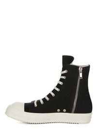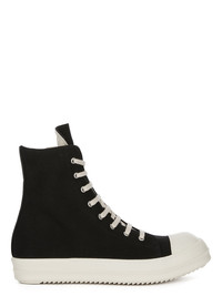 DRKSHDW SS25 HOLLYWOOD SNEAKS IN BLACK/MILK/MILK COTTON CANVAS THESE SNEAKS ARE ABOVE ANKLE HEIGHT AND FEATURE EIGHT EYELETS, LACES, A ZIPPER ON THE INSIDE ANKLE FOR EASY FASTENING, TOE CAPS AND SHARK-TOOTH SOLES THIS MEDIUMWEIGHT COTTON CANVAS IS COMPACT WITH A SOFT HANDFEEL. THIS GARMENT HAS BEEN GARMENT DYED. THIS FABRIC IS MADE USING GOTS CERTIFIED ORGANIC COTTON WHICH MEANS THE NATURAL FIBER IS GROWN WITHOUT HARMFUL CHEMICALS, LEAVING OUR SOIL, AIR AND WATER CLEANER FROM CONTAMINATES COLOR: BLACK/MILK/MILK MATERIAL: UPPER 100% COTTON TOE 70% POLYURETHANE + 30% VISCOSE LINING 100% COTTON SOLE 100% THERMOPLASTIC RUBBER SOLE HEIGHT 3.5CM