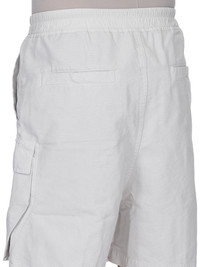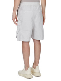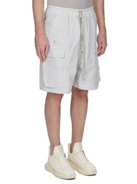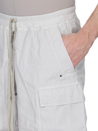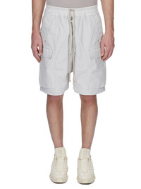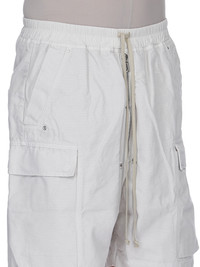 DRKSHDW SS26 TEMPLE CARGOBELA SHORTS IN BLACK 8OZ DEEP BLACK DENIM THESE CARGOBELA SHORTS ARE KNEE-LENGTH, WITH A LOW CROTCH AND WIDE LEG. THEY FEATURE AN ELASTICIZED WAISTBAND WITH DRAWSTRING AND A BELA EXPOSED CENTER ZIPPER WITH TWO SNAP DETAIL AT BOTTOM. THEY FEATURE TWO BEVELED CARGO POCKETS ON THE SIDE LEG WITH TWO REAR WELT POCKETS, ALL WITH CONCEALED SNAPS AND TOPSTITCHING. THIS LIGHTWEIGHT DEEP BLACK DENIM IS MADE ON AN ITALIAN 8OZ BLACK AND NATURAL DENIM. THE READY GARMENT IS OVERDYED BLACK AND THEN A DEEP BLACK WAX IS APPLIED IN A THICK LAYER BY HAND. THIS GARMENT IS TREATED IN AN ITALIAN WASH HOUSE BASED IN THE VENETO AREA OF ITALY, THAT PRODUCES IN SMALLER TREATMENT BATHS TO REDUCE WATER WASTE AND UTILIZE A WATER PURIFYING PROCESS THAT ENABLES THEM TO RECYCLE A PORTION OF THE WATER USED. ALL OF OUR DENIM WASHES ARE ZDHC CERTIFIED. COLOR: BLACK MATERIAL: 100% COTTON POCKETS LINING 52% POLYESTER + 48% COTTON MODEL IS 189CM TALL MODEL WEARS SIZE S