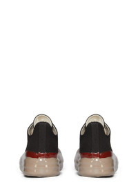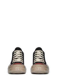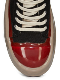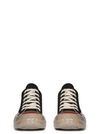 DRKSHDW FW25 CONCORDIANS LOW SNEAKS IN BLACK/RED/DRK BEIGE 13OZ OVERDYED DENIM THESE LOW SNEAKS ARE UNDER-ANKLE HEIGHT AND FEATURE SIX EYELETS, LACES, TOE CAPS AND SHARK TOOTH SOLES. THIS MEDIUMWEIGHT 13OZ DENIM IS OVERDYED AND HAS A SOFT AND WASHED HANDFEEL THIS FABRIC IS MADE USING GOTS CERTIFIED ORGANIC COTTON WHICH MEANS THE NATURAL FIBER IS GROWN WITHOUT HARMFUL CHEMICALS, LEAVING OUR SOIL, AIR AND WATER CLEANER FROM CONTAMINATES THESE SHOES HAVE BEEN TREATED WITH A RESISTANT SILICONE. THE SHOES ARE DIPPED BY HAND AND LEFT TO TRY MULTIPLE TIMES IN ORDER TO ACHIEVE THE MULTICOLORED EFFECT COLOR: BLACK/RED/DRK BEIGE MATERIAL: UPPER 100% COTTON TOE 70% POLYURETHANE + 30% VISCOSE LINING 100% COTTON SOLE HEIGHT 3.5CM