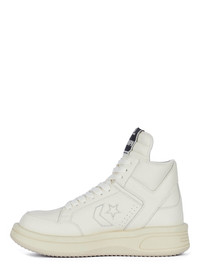 CONVERSE X DRKSHDW TURBOWPN IN WHITE/WHITE THIS PREMIUM LEATHER UPPER LACED HIGH TOP SHOE IS BASED ON THE CLASSIC CONVERSE “WEAPON” MODEL ORIGINATING FROM THE MID 80’S AND FAMOUSLY WORN BY BASKET BALL PLAYERMAGIC JOHNSON. IT HAS THE SIGNATURE DRKSHDW ELONGATED TONGUE WITH CUSTOM BRANDED WRAP AROUND WOVEN LABEL, BEARING THE MODEL NAME, A WHITE LEATHER UPPER, WHITE SOLE AND OUTSOLE. IT FEATURES AN EXAGGERATED FOAM MOLDED TOE AND OVERSIZED WEAPON TOOLING WITH SIGNATURE DRKSHDW SAWTOOTH OUTSOLE. CX FOAM INTERNAL MIDSOLE AND CX FOAM SOCK LINER IT HAS THE PENTAGRAM COLLAB LOGO ON THE LATERAL QUARTER, AIR VENT PERFORATIONS ON TOE AND SIDE, AND COLLAB LOGO ON THE SOLE. COLOR: WHITE/WHITE MATERIAL: UPPER 100% COW LEATHER INSOLE 60% POLYURETHANE + 40% POLYESTER SOLE 100% RUBBER PLEASE NOTE THE SHOE SIZE LISTED ON THE PRODUCT DESCRIPTION PAGE CORRESPONDS TO USA MEN'S SHOE SIZE WE STRONGLY RECOMMEND OUR CLIENTS CHECK THE SIZE CHART BEFORE PLACING AN ORDER TO AVOID ANY POTENTIAL INCONVENIENCE FEEL FREE TO CONTACT CUSTOMERCARE@RICKOWENS.EU FOR ANY ASSISTANCE.