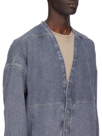 DRKSHDW FW25 CONCORDIANS LIDO LARRY SHIRT IN WASHED GREY 13OZ STONE WASHED GREY DENIM THIS LIDO LARRY SHIRT IS MID THIGH-LENGTH WITH LONG SLEEVES. IT HAS A DEEP V NECK AND CENTRE FRONT OPENING WITH CONCEALED SNAP CLOSURES. IT HAS LEVEL SHOULDER SEAMS, A BACK YOKE WITH COTTON WEBBING STRAP WITH RIVET DETAIL, AND CUFFS WITH CONCEALED SNAPS. IT FEATURES A RAW CUT HEM. IT IS UNLINED AND HAS TWO INTERNAL ZIPPERED POCKETS. THIS MEDIUMWEIGHT STONE WASHED GREY DENIM IS MADE ON A 13OZ JAPANESE GREY AND BLACK DENIM WOVEN IN FUKUYAMA PREFECTURE BY A MILL FOUNDED IN 1893. THE READY GARMENT IS STONE WASHED THIS GARMENT IS TREATED IN AN ITALIAN WASH HOUSE BASED IN THE VENETO AREA OF ITALY, THAT PRODUCES IN SMALLER TREATMENT BATHS TO REDUCE WATER WASTE AND UTILIZE A WATER PURIFYING PROCESS THAT ENABLES THEM TO RECYCLE A PORTION OF THE WATER USED. ALL OF OUR DENIM WASHES ARE ZDHC CERTIFIED COLOR: WASHED GREY MATERIAL: 100% COTTON MODEL IS 189CM TALL MODEL WEARS SIZE S