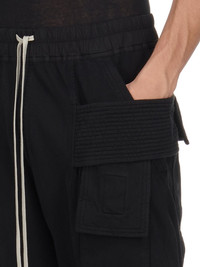 DRKSHDW SS25 HOLLYWOOD CREATCH CARGO DRAWSTRING IN BLACK COMPACT COTTON JERSEY THESE CREATCH CARGO DRAWSTRING PANTS ARE FULL LENGTH. THEY HAVE AN ELASTICIZED WAISTBAND WITH DRAWSTRING AND STITCHED FLY. THEY FEATURE LAYERED FRONT POCKETS WITH SIDE BELT STRAPS WITH SIGNATURE STITCHING LINES AND TWO BACK SQUARE PATCH POCKETS WITH FLAPS AND TOPSTITCHING THIS HEAVYWEIGHT AND COMPACT COTTON JERSEY HAS A BRUSHED AND SOFT HANDFEEL. THIS JERSEY IS GARMENT DYED. THIS FABRIC IS MADE USING GOTS CERTIFIED ORGANIC COTTON WHICH MEANS THE NATURAL FIBER IS GROWN WITHOUT HARMFUL CHEMICALS, LEAVING OUR SOIL, AIR AND WATER CLEANER FROM CONTAMINATES COLOR: BLACK MATERIAL: 100% COTTON MODEL IS 189CM TALL MODEL WEARS SIZE S