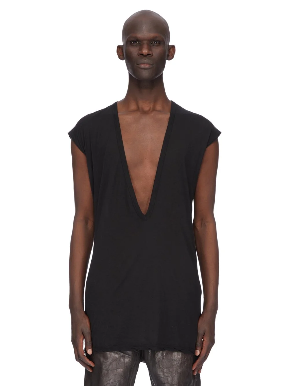 DRKSHDW FW25 CONCORDIANS DYLAN T IN BLACK BLACK COTTON GAUZE JERSEY THIS DYLAN T IS BELOW HIP LENGTH, IT HAS AN EXTREME DEEP V NECK WITH WIDE TANK SHOULDERS WITH REINFORCED RAW CUT ARMHOLES. IT FEATURES THE SIGNATURE SINGLE SEAM RUNNING DOWN THE CENTRE BACK SPINE. THIS LIGHTWEIGHT AND AIRY COTTON GAUZE JERSEY IS SEMI TRANSPARENT AND HAVE A SOFT WASHED HANDFEEL. THIS JERSEY IS GARMENT DYED THIS FABRIC IS MADE USING GOTS CERTIFIED ORGANIC COTTON WHICH MEANS THE NATURAL FIBER IS GROWN WITHOUT HARMFUL CHEMICALS, LEAVING OUR SOIL, AIR AND WATER CLEANER FROM CONTAMINATES COLOR: BLACK MATERIAL: 100% COTTON MODEL IS 189CM TALL MODEL WEARS SIZE S