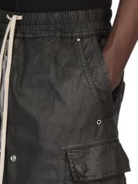 DRKSHDW SS26 TEMPLE CARGOBELA SHORTS IN BLACK 8OZ DEEP BLACK DENIM THESE CARGOBELA SHORTS ARE KNEE-LENGTH, WITH A LOW CROTCH AND WIDE LEG. THEY FEATURE AN ELASTICIZED WAISTBAND WITH DRAWSTRING AND A BELA EXPOSED CENTER ZIPPER WITH TWO SNAP DETAIL AT BOTTOM. THEY FEATURE TWO BEVELED CARGO POCKETS ON THE SIDE LEG WITH TWO REAR WELT POCKETS, ALL WITH CONCEALED SNAPS AND TOPSTITCHING. THIS LIGHTWEIGHT DEEP BLACK DENIM IS MADE ON AN ITALIAN 8OZ BLACK AND NATURAL DENIM. THE READY GARMENT IS OVERDYED BLACK AND THEN A DEEP BLACK WAX IS APPLIED IN A THICK LAYER BY HAND. THIS GARMENT IS TREATED IN AN ITALIAN WASH HOUSE BASED IN THE VENETO AREA OF ITALY, THAT PRODUCES IN SMALLER TREATMENT BATHS TO REDUCE WATER WASTE AND UTILIZE A WATER PURIFYING PROCESS THAT ENABLES THEM TO RECYCLE A PORTION OF THE WATER USED. ALL OF OUR DENIM WASHES ARE ZDHC CERTIFIED. COLOR: BLACK MATERIAL:100% COTTON POCKETS LINING 52% POLYESTER + 48% COTTON MODEL IS 189CM TALL MODEL WEARS SIZE S
