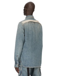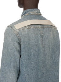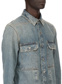 DRKSHDW SS26 TEMPLE OUTERSHIRT IN WASHED INDIGO 13OZ DISTRESSED WASHED INDIGO THIS OUTERSHIRT IS BELOW HIP LENGTH WITH A STRAIGHT FIT. IT HAS A CENTRE FRONT PLACKET WITH VISIBLE METAL BUTTONS, A CLASSIC COLLAR AND A HEMLINE WITH BEVELED SIDES SEAMS. IT FEATURES SQUARE CHEST POCKETS WITH BUTTONS AND BEVELED CORNER FLAPS. IT HAS LONG SLEEVES WITH BUTTONED CUFFS, SIGNATURE LEVEL SHOULDER SEAMS, A BACK YOKE AND DOUBLE TOP STITCHING ON ALL SEAMS. THIS MEDIUMWEIGHT DISTRESSED WASHED INDIGO DENIM IS MADE ON A 13OZ JAPANESE INDIGO AND NATURAL DENIM. THE READY GARMENT IS STONE WASHED AND THEN DISTRESSED BY HAND. THIS GARMENT IS TREATED IN AN ITALIAN WASH HOUSE BASED IN THE VENETO AREA OF ITALY, THAT PRODUCES IN SMALLER TREATMENT BATHS TO REDUCE WATER WASTE AND UTILIZE A WATER PURIFYING PROCESS THAT ENABLES THEM TO RECYCLE A PORTION OF THE WATER USED. ALL OF OUR DENIM WASHES ARE ZDHC CERTIFIED. COLOR: WASHED INDIGO MATERIAL:100% COTTON INSIDE POCKETS 52% POLYESTER + 48% COTTON MODEL IS 189CM TALL MODEL WEARS SIZE S