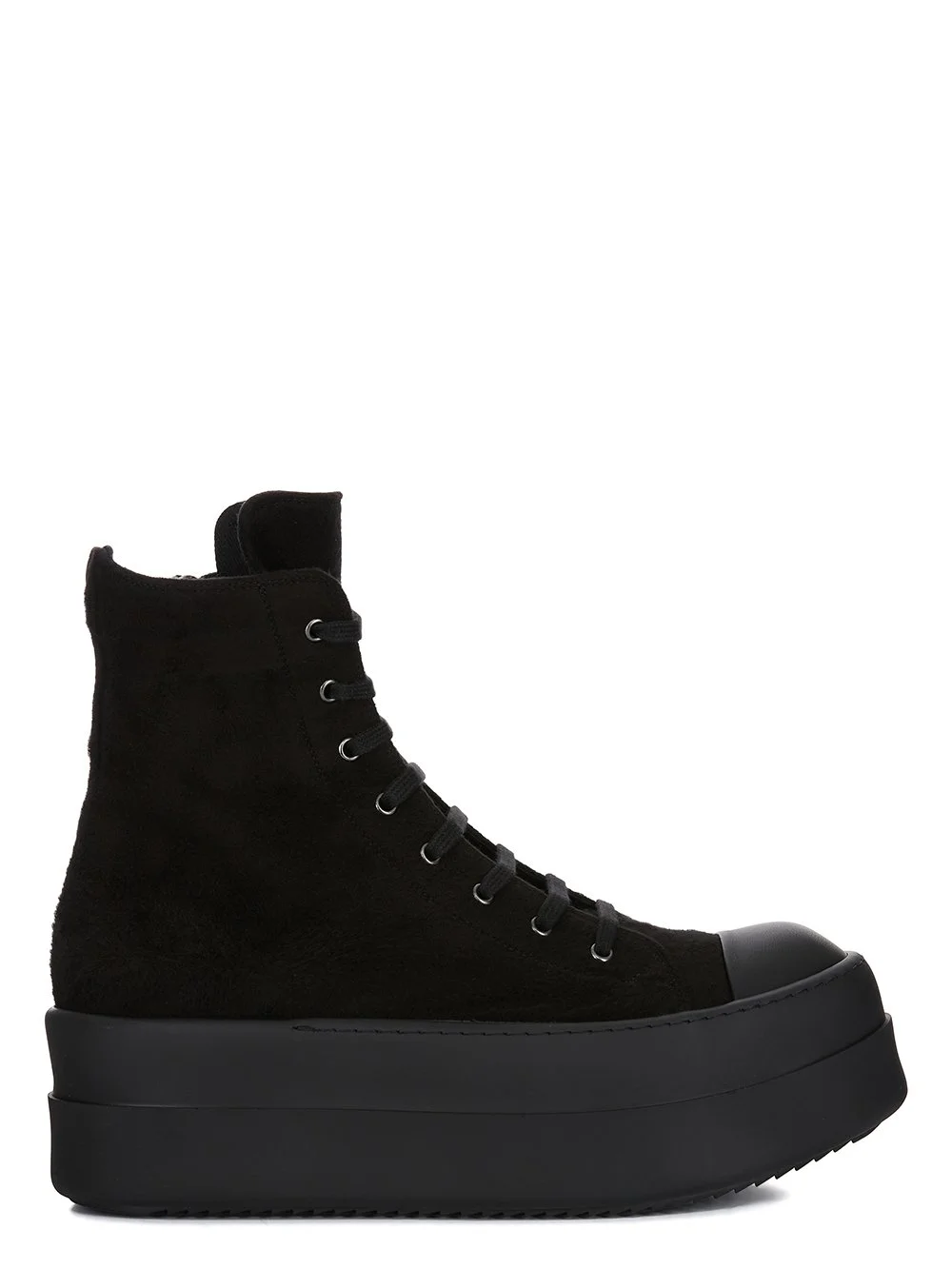 DRKSHDW FW25 CONCORDIANS DOUBLE BUMPER SNEAKS IN ALL BLACK BRUSHED COTTON THESE DOUBLE BUMPER SNEAKS ARE ABOVE ANKLE HEIGHT AND FEATURE EIGHT EYELETS, LACES, A ZIPPER ON THE INSIDE ANKLE FOR EASY FASTENING, TOE CAPS AND DOUBLE HEIGHT BUMPER SHARK TOOTH SOLES. THIS MEDIUMWEIGHT BRUSHED COTTON FABRIC IS GARMENT DYED WITH A SOFT AND BRUSHED HANDFEEL THIS FABRIC IS MADE USING GOTS CERTIFIED ORGANIC COTTON WHICH MEANS THE NATURAL FIBER IS GROWN WITHOUT HARMFUL CHEMICALS, LEAVING OUR SOIL, AIR AND WATER CLEANER FROM CONTAMINATES COLOR: ALL BLACK MATERIAL: UPPER 100% COTTON TOE 70% POLYURETHANE + 30% VISCOSE LINING 100% COTTON SOLE HEIGHT 6.5CM