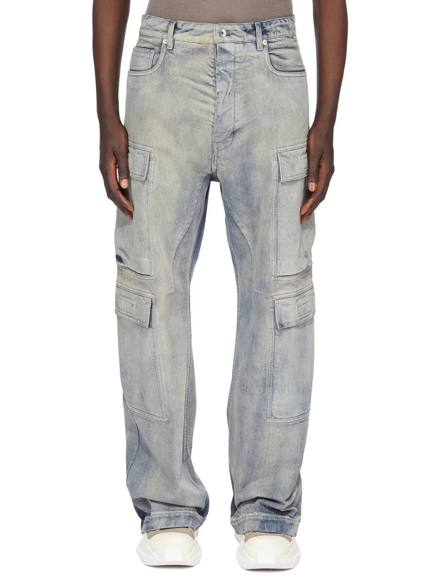 DRKSHDW FW25 CONCORDIANS DOUBLE CARGO JEANS IN 13OZ MINERAL PEARL DENIM THESE DOUBLE CARGO JEANS ARE A FULL LENGTH 5-POCKET JEAN WITH A LOW-RISE AND A LOOSE FIT. THEY HAVE A CONCEALED SILVER ZIPPER FLY WITH TOP BUTTON, BELT LOOPS AND POCKET RIVETS AND THEY FEATURE TWO BEVELED CARGO POCKETS ON THE THIGH, WITH TWO SQUARE CARGO POCKETS BELOW AND TWO SQUARE BACK POCKETS. THEY ALL HAVE FLAPS AND TOPSTITCHING. THIS MEDIUMWEIGHT MINERAL PEARL DENIM IS MADE ON A 13OZ INDIGO AND NATURAL DENIM. THE READY GARMENT IS STONE WASHED TOGETHER WITH A MINERAL DYE. THIS GARMENT IS TREATED IN AN ITALIAN WASH HOUSE BASED IN THE VENETO AREA OF ITALY, THAT PRODUCES IN SMALLER TREATMENT BATHS TO REDUCE WATER WASTE AND UTILIZE A WATER PURIFYING PROCESS THAT ENABLES THEM TO RECYCLE A PORTION OF THE WATER USED. ALL OF OUR DENIM WASHES ARE ZDHC CERTIFIED. COLOR: MINERAL PEARL MATERIAL: 100% COTTON POCKETS LINING 52% POLYESTER + 48% COTTON MODEL IS 189CM TALL MODEL WEARS SIZE 31