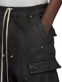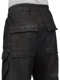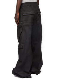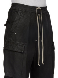 RICK OWENS FW24 PORTERVILLE DOUBLE CARGO JUMBO BELAS IN BLACK WAX BLACK WAX STRETCH DENIM THESE DOUBLE CARGO JUMBO BELA PANTS ARE FULL-LENGTH, WITH A LOW CROTCH AND WIDE LEG. THEY FEATURE AN ELASTICIZED WAISTBAND WITH DRAWSTRING AND A BELA EXPOSED CENTER ZIPPER WITH TWO SNAP DETAIL AT BOTTOM, AND SIDE WELT POCKETS WITH RIVETS. THEY FEATURE TWO BEVELED CARGO POCKETS ON THE THIGH, WITH TWO SQUARE CARGO POCKETS BELOW, AND TWO SQUARE BACK POCKETS, ALL HAVE FLAPS AND TOPSTITCHING THIS LIGHTWEIGHT STRETCH DENIM IS OVERDYED AND THEN SPRAYED WITH A SOFT BLACK WAX FINISH THIS GARMENT IS TREATED IN AN ITALIAN WASH HOUSE BASED IN THE VENETO AREA OF ITALY, THAT PRODUCES IN SMALLER TREATMENT BATHS TO REDUCE WATER WASTE AND UTILIZE A WATER PURIFYING PROCESS THAT ENABLES THEM TO RECYCLE A PORTION OF THE WATER USED. ALL OF OUR DENIM WASHES ARE ZDHC CERTIFIED - COLOR: BLACK WAX - MATERIAL: 91% COTTON + 6% ELASTOMULTIESTER + 3% RUBBER - POCKETS LINING 100% COTTON - MODEL IS 189CM TALL - MODEL WEARS SIZE S