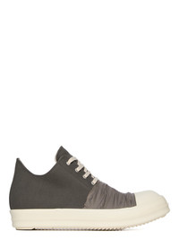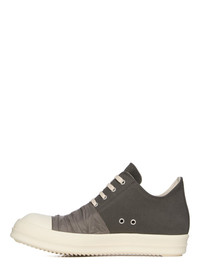 DRKSHDW SS25 HOLLYWOOD HUSTLER LOW SNEAKS IN DARK DUST/DUST/MILK 13OZ OVERDYED DENIM AND RECYCLED NYLON THESE HUSTLER LOW SNEAKS ARE UNDER-ANKLE HEIGHT AND FEATURE SIX EYELETS, LACES, TOE CAPS AND SHARK TOOTH SOLES. THEY FEATURE AN OVERLAY OF FABRIC ACROSS THE FRONT FROM TOE CAP AND COVERING THE FIRST LACE AND EYELET THIS IS A COMBINATION OF 13OZ OVERDYED DENIM AND RECYCLED NYLON THIS MEDIUMWEIGHT 13OZ DENIM IS OVERDYED AND HAS A SOFT AND WASHED HANDFEEL. THIS FABRIC IS MADE USING GOTS CERTIFIED ORGANIC COTTON WHICH MEANS THE NATURAL FIBER IS GROWN WITHOUT HARMFUL CHEMICALS, LEAVing OUR SOIL, AIR AND WATER CLEANER FROM CONTAMINATES COLOR: DARK DUST/DUST/MILK MATERIAL: 100% COTTON + 100% POLYAMIDE SOLE HEIGHT 3.5CM
