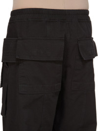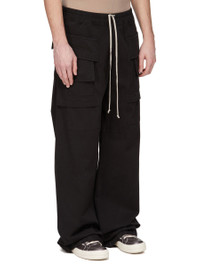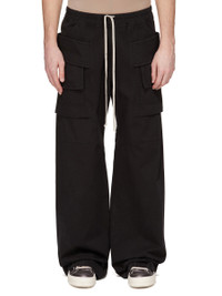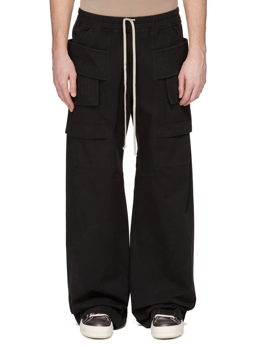 DRKSHDW FW25 CONCORDIANS CREATCH WIDE CARGO DRAWSTRING IN BLACK COTTON TWILL. THESE WIDE CREATCH CARGO DRAWSTRING PANTS ARE FULL LENGTH. THEY HAVE AN ELASTICIZED WAISTBAND WITH DRAWSTRING AND STITCHED FLY. THEY FEATURE LAYERED FRONT POCKETS WITH SIDE BELT STRAPS WITH SIGNATURE STITCHING LINES AND TWO BACK SQUARE PATCH POCKETS WITH FLAPS AND TOPSTITCHING. THIS MEDIUMWEIGHT WORKWEAR COTTON TWILL IS GARMENT DYED WITH A SOFT AND WASHED HANDFEEL. THIS FABRIC IS MADE USING GOTS CERTIFIED ORGANIC COTTON WHICH MEANS THE NATURAL FIBER IS GROWN WITHOUT HARMFUL CHEMICALS, LEAVING OUR SOIL, AIR AND WATER CLEANER FROM CONTAMINATES. COLOR: BLACK MATERIAL:100% COTTON MODEL IS 189CM TALL MODEL WEARS SIZE S