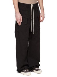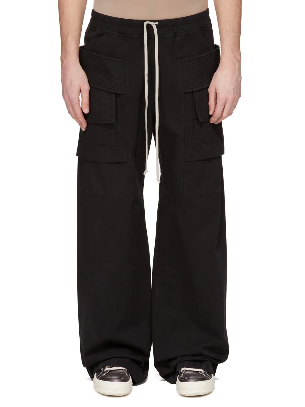 DRKSHDW FW25 CONCORDIANS CREATCH WIDE CARGO DRAWSTRING IN BLACK COTTON TWILL THESE WIDE CREATCH CARGO DRAWSTRING PANTS ARE FULL LENGTH. THEY HAVE AN ELASTICIZED WAISTBAND WITH DRAWSTRING AND STITCHED FLY. THEY FEATURE LAYERED FRONT POCKETS WITH SIDE BELT STRAPS WITH SIGNATURE STITCHING LINES AND TWO BACK SQUARE PATCH POCKETS WITH FLAPS AND TOPSTITCHING THIS MEDIUMWEIGHT WORKWEAR COTTON TWILL IS GARMENT DYED WITH A SOFT AND WASHED HANDFEEL THIS FABRIC IS MADE USING GOTS CERTIFIED ORGANIC COTTON WHICH MEANS THE NATURAL FIBER IS GROWN WITHOUT HARMFUL CHEMICALS, LEAVING OUR SOIL, AIR AND WATER CLEANER FROM CONTAMINATES COLOR: BLACK MATERIAL:100% COTTON MODEL IS 189CM TALL MODEL WEARS SIZE S