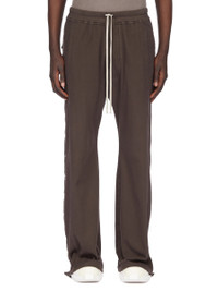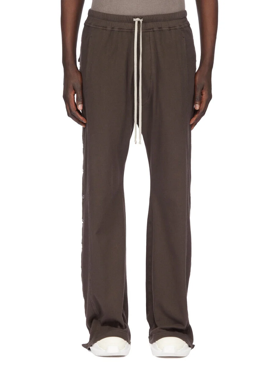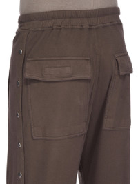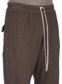 DRKSHDW FW25 CONCORDIANS PUSHER PANTS IN DRKDUST DOUBLE BRUSHED JERSEY THESE PUSHER PANTS ARE FLOOR LENGTH WITH A WIDE LEG AND A SLIGHTLY DROPPED CROTCH. THEY HAVE AN ELASTICIZED WAISTBAND WITH DRAWSTRING, SIDE FRONT JET POCKETS AND SQUARE BACK POCKETS WITH TOPSTITCHING. THEY FEATURE VISIBLE SNAP CLOSURES RUNNING DOWN THE OUTER LEG, ALLOWING THEM TO BE UNSNAPPED AND WORN OPEN. THIS MEDIUMWEIGHT COTTON JERSEY IS BRUSHED ON BOTH SIDES WHICH GIVES THE FABRIC A SOFT AND PEACHY HANDFEEL. THIS JERSEY IS GARMENT DYED. THIS FABRIC IS MADE USING GOTS CERTIFIED ORGANIC COTTON WHICH MEANS THE NATURAL FIBER IS GROWN WITHOUT HARMFUL CHEMICALS, LEAVING OUR SOIL, AIR AND WATER CLEANER FROM CONTAMINATES. COLOR: DRKDUST MATERIAL: 100% COTTON MODEL IS 189CM TALL MODEL WEARS SIZE S