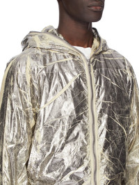 DRKSHDW FW25 CONCORDIANS SEALED WINDBREAKERÂ IN PALLADIUM FOIL LIGHT NYLON THIS SEALED WINDBREAKER IS HIP-LENGTH WITH LONG SLEEVES. IT FEATURES A CENTRE FRONT ZIPPER THAT RUNS UP AND AROUND THE HOOD, SO THAT IT CAN CLOSE COMPLETELY OVER THE FACE. IT HAS TWO LARGE SIDE FRONT POCKETS WITH ROUNDED TOPSTITCHING AND VISIBLE SNAP CLOSURE, SIGNATURE CENTRE FRONT SEAM AND ELASTICIZED CUFF AND HEM. THIS VERSION IS PADDED AND HAS INTERNAL SNAP POCKETS. THIS AIRY AND LIGHTWEIGHT NYLON IS TREATED WITH A PALLADIUM FOIL OVERLAY AND WASHED TO ACHIEVE THE IRREGULAR LOOK THIS FABRIC IS MADE USING GRS CERTIFIED RECYCLED NYLON WHICH ENSURES A REDUCTION IN WATER CONSUMPTION, EMISSIONS AND HAZARDOUS WASTE, LESSENING THE DEPENDENCE ON NON-RENEWABLE RESOURCES COLOR: PALLADIUM MATERIAL: 100% NYLON MODEL IS 181CM TALL MODEL WEARS SIZE S