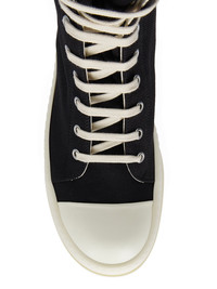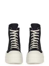 DRKSHDW SS25 HOLLYWOOD DOUBLE BUMPER SNEAKS IN BLACK/PEARL/MILK/MILK 13OZ OVERDYED DENIM THESE DOUBLE BUMPER SNEAKS ARE ABOVE ANKLE HEIGHT AND FEATURE EIGHT EYELETS, LACES, A ZIPPER ON THE INSIDE ANKLE FOR EASY FASTENING, TOE CAPS AND DOUBLE HEIGHT BUMPER SHARK-TOOTH SOLES THIS MEDIUMWEIGHT 13OZ DENIM IS OVERDYED AND HAS A SOFT AND WASHED HANDFEEL. THIS FABRIC IS MADE USING GOTS CERTIFIED ORGANIC COTTON WHICH MEANS THE NATURAL FIBER IS GROWN WITHOUT HARMFUL CHEMICALS, LEAVing OUR SOIL, AIR AND WATER CLEANER FROM CONTAMINATES COLOR: BLACK/PEARL/MILK/MILK MATERIAL: UPPER 100% COTTON TOE 70% POLYURETHANE + 30% VISCOSE LINING 100% COTTON SOLE 100% THERMOPLASTIC RUBBER EMBROIDERY 100% POLYESTER SOLE HEIGHT 6.5CM