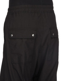 DRKSHDW SS26 TEMPLE GETH BELAS IN BLACK COTTON RIP STOP THESE GETH BELA PANTS ARE FULL-LENGTH WITH A LOW CROTCH AND WIDE LEG. THEY FEATURE AN ELASTICIZED WAISTBAND WITH VERTICAL STITCHING, DRAWSTRING AND A BELA EXPOSED CENTER ZIPPER WITH TWO SNAP DETAIL AT BOTTOM. THEY HAVE SIDE POCKETS WITH EYELET, RIVET DETAIL, BACK POCKETS WITH FLAPS AND VISIBLE SNAP CLOSURES. THIS LIGHTWEIGHT AND CRISPY COTTON POPLIN IS WOVEN WITH A RIP STOP PATTERN. THIS GARMENT HAS BEEN GARMENT DYED. THIS FABRIC IS MADE USING GOTS CERTIFIED ORGANIC COTTON WHICH MEANS THE NATURAL FIBER IS GROWN WITHOUT HARMFUL CHEMICALS, LEAVING OUR SOIL, AIR AND WATER CLEANER FROM CONTAMINATES. COLOR: BLACK MATERIAL:100% COTTON MODEL IS 189CM TALL MODEL WEARS SIZE S