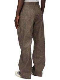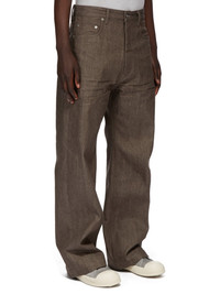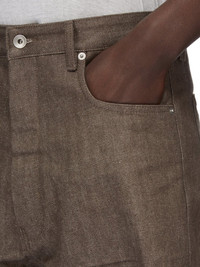 RICK OWENS FW24 PORTERVILLE GETH JEANS IN DARK DUST 13OZ DRKDUST DENIM THESE GETH JEANS ARE A FULL LENGTH, 5 POCKET JEAN WITH A MID-RISE AND WIDE FIT. THEY HAVE A SILVER BUTTON FLY, A WAISTBAND WITH BELT LOOPS AND POCKET RIVETS. THEY HAVE REAR PATCH POCKETS AND TOPSTITCHING THIS MEDIUMWEIGHT DENIM IS A 13OZ JAPANESE SELVEDGE DENIM WOVEN IN FUKUYAMA CITY, HIROSHIMA. IT HAS A STIFF HANDFEEL SINCE THE DENIM IS LEFT RAW, UNTREATED. - COLOR: DARK DUST - MATERIAL: 100% COTTON - POCKETS LINING 52% POLYESTER + 48% COTTON - MODEL IS 189CM TALL - MODEL WEARS SIZE 31