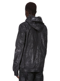 DRKSHDW SS25 HOLLYWOOD GIMP FLIGHT BOMBER IN BLACK FOIL COTTON POPLIN THIS GIMP FLIGHT BOMBER IS HIP LENGTH WITH LONG SLEEVES. IT HAS A FRONT ZIPPER CLOSURE WITH SLIM PLACKET THAT RUNS FROM THE HEM ALL THE WAY UP THROUGH THE HOOD, ALLOWING IT TO BE ZIPPED COMPLETELY CLOSED OVER THE FACE, WITH FOUR METAL EYELETS AND EYE SLITS. IT HAS TWO SIDE PATCH POCKETS WITH SNAPS AND ONE SMALL FLIGHT POCKET WITH ZIPPER ON THE LEFT SLEEVE. IT HAS A RIBBED COLLAR, CUFFS AND WAISTBAND. IT IS FULLY LINED AND HAS TWO INSIDE POCKETS WITH SNAPS THIS LIGHTWEIGHT POPLIN HAS A SOFT HANDFEEL AND WASHED FINISH. THIS GARMENT HAS BEEN GARMENT DYED AND HAS A CLEAR, SEMI SHINY FOIL OVERLAY THAT CREATES A WAXY TOUCH. SINCE THE FOIL IS PRESSED ON TOP OF THE FINAL GARMENTS, EACH PIECE WILL HAVE ITS OWN UNIQUE LOOK AND CREASES SINCE THE FOIL WILL ATTACH TO DIFFERENT PLACES DEPENDING ON THE GARMENT THIS FABRIC IS MADE USING GOTS CERTIFIED ORGANIC COTTON WHICH MEANS THE NATURAL FIBER IS GROWN WITHOUT HARMFUL CHEMICALS, LEAVING OUR SOIL, AIR AND WATER CLEANER FROM CONTAMINATES COLOR: BLACK MATERIAL: 100% COTTON MODEL IS 189CM TALL MODEL WEARS SIZE S