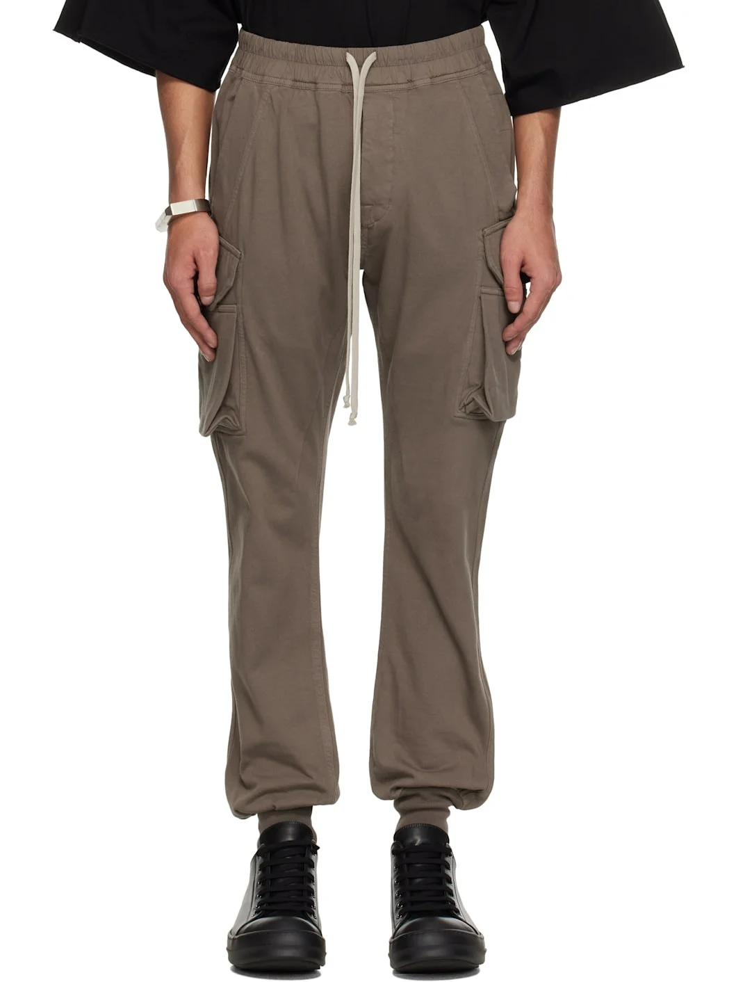 Garment-dyed heavyweight GOTS-certified organic cotton jersey cargo pants. · Slim-fit · Drawstring at elasticized waistband · Four-pocket styling · Button fly · Rib-knit cuffs · Cargo pocket at outseams Supplier color: Dust Body: 100% organic cotton. Trim: 97% cotton, 3% elastane. Made in Italy 251126M188015