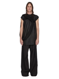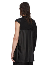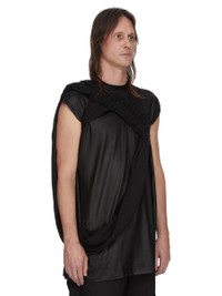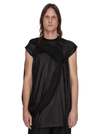 DRKSHDW SS26 TEMPLE HARNESS TANK IN BLACK COTTON GAUZE JERSEY THIS HARNESS TANK FITS OVER THE HEAD AND UNDER THE ARMS. IT HAS TANK SHOULDERS, A ROUNDED NECK AND COVERS THE SHOULDERS AT BACK. IT FEATURES A DRAPE OF FABRIC THAT RUCHES ON THE CHEST AND DRAPES DOWN, IN FOLDS, FROM THE LEFT FRONT TO THE RIGHT HIP, SCOOPING BACK UP TO THE RIGHT SHOULDER AT BACK. THIS LIGHTWEIGHT AND AIRY COTTON GAUZE JERSEY IS SEMI TRANSPARENT AND HAVE A SOFT WASHED HAND FEEL. THIS JERSEY IS GARMENT DYED. THIS FABRIC IS MADE USING GOTS CERTIFIED ORGANIC COTTON WHICH MEANS THE NATURAL FIBER IS GROWN WITHOUT HARMFUL CHEMICALS, LEAVING OUR SOIL, AIR AND WATER CLEANER FROM CONTAMINATES. COLOR: BLACK MATERIAL:100% COTTON MODEL IS 189CM TALL MODEL WEARS SIZE S