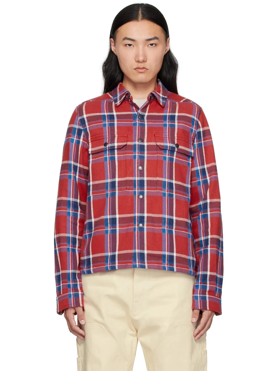 Lightweight 9 oz cotton flannel overshirt. Check pattern throughout. · Spread collar · Press-stud closure · Flap pockets · Cropped hem · Press-stud barrel cuffs Supplier color: Red plaid 100% cotton. Made in Japan 251126M192004