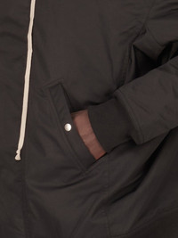 DRKSHDW FW24 PORTERVILLE HOODED LONG BOMBER IN BLACK COTTON NYLON FAILLE THIS HOODED LONG BOMBER IS BELOW HIP LENGTH WITH LONG SLEEVES AND A JUMBO OVERSIZED FIT. IT HAS A CENTRE ZIPPER CLOSURE, COVERED BY A FLAP, THAT SECURES WITH SNAPS, RUNNING DOWN A WEBBING STRAP. IT HAS A FUNNEL NECK AND WIDE HOOD WITH DRAWSTRING THAT CAN BE ZIPPED OPEN, DOWN THE CENTRE BACK HEAD, AND IS EDGED WITH LINES OF SIGNATURE STITCHING THAT THEN RUN DOWN THE INSIDE OF THE FRONT FLAP. IT HAS SIGNATURE LEVEL SHOULDER SEAMS, TWO SIDE WELT POCKETS WITH SNAPS, AND A RIBBED CUFFS AND WAISTBANDIT IS FULLY LINED AND HAS TWO INSIDE POCKETS WITH SNAPS THIS COTTON NYLON BLEND HAS A MICRO FAILLE STRUCTURE AND A SOFT HANDFEEL. THIS PRODUCT WAS MADE USING CERTIFIED RECYCLED POLYAMIDE BECAUSE IS ENSURES A REDUCTION IN WATER CONSUMPTION, EMISSIONS AND HAZARDOUS WASTE, LESSENING THE DEPENDENCE ON NON-RENEWABLE RESOURCES THIS FABRIC WAS ALSO MADE USING GOTS CERTIFIED ORGANIC COTTON WHICH MEANS THE NATURAL FIBER IS GROWN WITHOUT HARMFUL CHEMICALS, LEAVING OUR SOIL, AIR AND WATER CLEANER FROM CONTAMINATES - COLOR: BLACK - MATERIAL: 53% POLYAMIDE 47% COTTON - MODEL IS 189CM TALL - MODEL WEARS SIZE S
