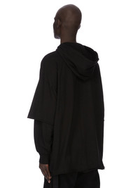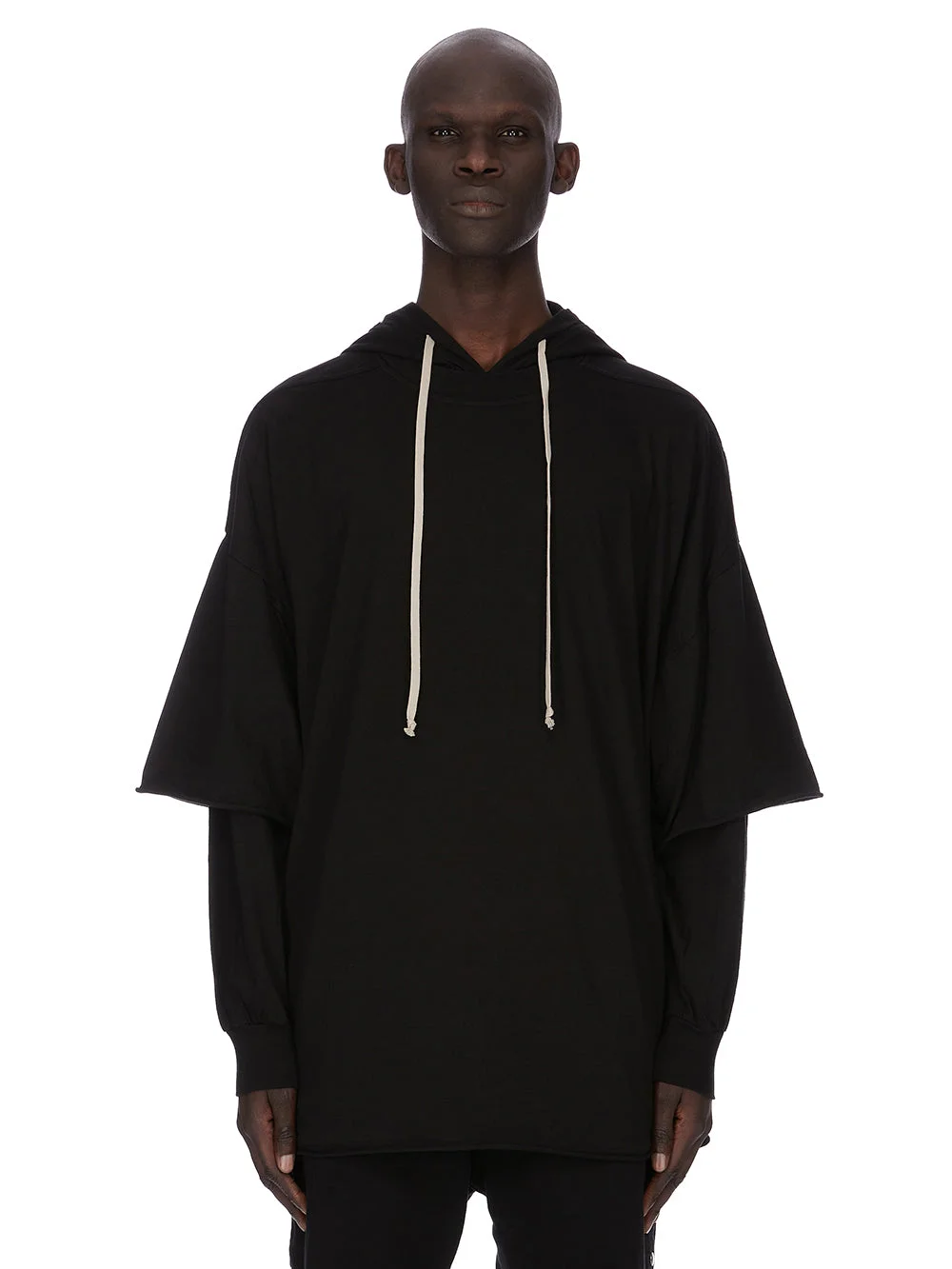 DRKSHDW SS26 TEMPLE TOMMY HUSTLER HOODIE IN BLACK MEDIUM WEIGHT COTTON JERSEY THIS TOMMY HUSTLER HOODIE IS BELOW-HIP LENGTH WITH A JUMBO OVERSIZED FIT. IT FEATURES A LONG SLEEVE T-SHIRT WITH RIBBED CUFFS AND A DRAWSTRING HOOD, OVERLAID WITH A CROPPED OVERSIZE T-SHIRT WITH ELBOW LENGTH SLEEVES. IT HAS THE SIGNATURE LEVEL SHOULDER SEAMS AND SINGLE SEAM RUNNING DOWN THE CENTRE BACK SPINE. THIS MEDIUMWEIGHT COTTON JERSEY HAS A COMPACT AND DRY HANDFEEL. THIS JERSEY IS GARMENT DYED. THIS FABRIC IS MADE USING GOTS CERTIFIED ORGANIC COTTON WHICH MEANS THE NATURAL FIBER IS GROWN WITHOUT HARMFUL CHEMICALS, LEAVING OUR SOIL, AIR AND WATER CLEANER FROM CONTAMINATES. COLOR: BLACK MATERIAL:100% COTTON MODEL IS 189CM TALL ITEM IS AVAILABLE IN ONE SIZE
