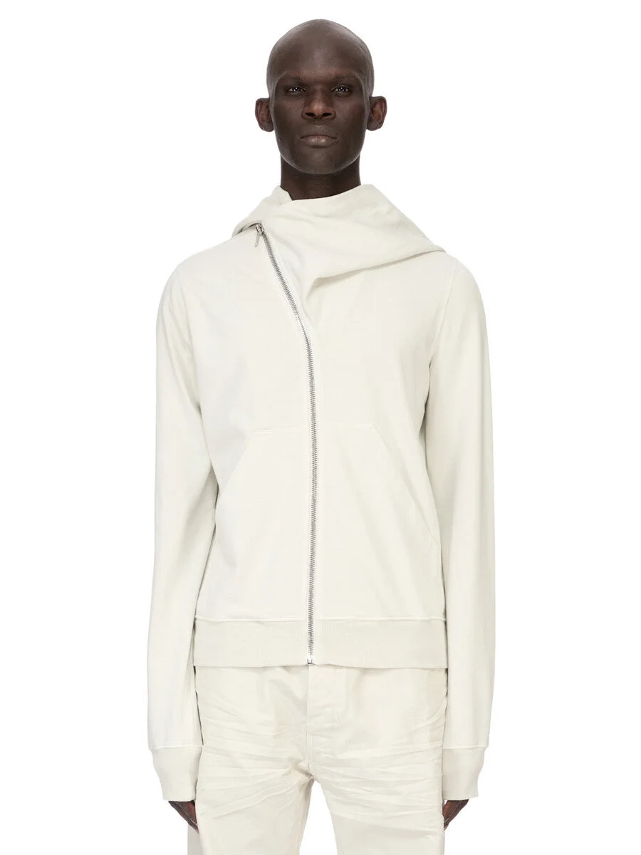 DRKSHDW SS26 TEMPLE MOUNTAIN HOODIE IN MILK WASH COMPACT HEAVY JERSEY THIS MOUNTAIN HOODIE IS ABOVE HIP LENGTH WITH LONG SLEEVES. IT HAS A CURVED ASYMMETRICAL ZIPPER CLOSURE, A SMALL FUNNEL NECK AND A LARGE POINTED HOOD. IT HAS TWO FRONT PATCH POCKETS, RIBBED CUFFS AND WAISTBAND SIGNATURE SINGLE SEAM RUNNING DOWN THE CENTRE BACK SPINE. THIS HEAVYWEIGHT AND COMPACT COTTON JERSEY HAS A BRUSHED AND SOFT HANDFEEL. THIS JERSEY IS GARMENT DYED. THIS FABRIC IS MADE USING GOTS CERTIFIED ORGANIC COTTON WHICH MEANS THE NATURAL FIBER IS GROWN WITHOUT HARMFUL CHEMICALS, LEAVING OUR SOIL, AIR AND WATER CLEANER FROM CONTAMINATES. COLOR: MILK WASH MATERIAL:100% COTTON MODEL IS 189CM TALL MODEL WEARS SIZE S