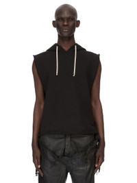 DRKSHDW SS26 TEMPLE HOODED TUNIC IN BLACK FURKA HEAVY SWEATSHIRT JERSEY THIS HOODED TUNIC IS HIP LENGTH AND SLEEVELESS. IT HAS A LARGE HOOD AND A WIDE SQUARE BODY. THIS HEAVYWEIGHT COTTON SWEATSHIRT JERSEY HAS A SOFT AND WASHED HANDFEEL. THIS JERSEY IS GARMENT DYED. THIS FABRIC IS MADE USING GOTS CERTIFIED ORGANIC COTTON WHICH MEANS THE NATURAL FIBER IS GROWN WITHOUT HARMFUL CHEMICALS, LEAVING OUR SOIL, AIR AND WATER CLEANER FROM CONTAMINATES. COLOR: BLACK MATERIAL:100% COTTON MODEL IS 189CM TALL MODEL WEARS SIZE S