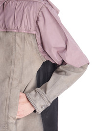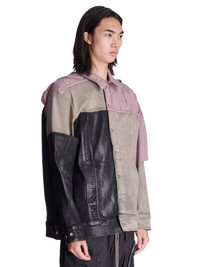 RICK OWENS SS23 EDFU JUMBO WORKER JKT IN BLACK DENIM COLLAGE THIS JUMBO WORKER JACKET IS BELOW HIP LENGTH AND JUMBO OVERSIZED WITH LONG SLEEVES. IT FEATURES A CENTRE FRONT PLACKET WITH VISIBLE BUTTONS, AND A CLASSIC COLLAR AND BUTTONED CUFFS. IT HAS A WAISTBAND HEM WITH BUTTON DETAIL, SIDE POCKETS, AND DOUBLE TOP STITCHING ON ALL SEAMS. IT HAS TWO INTERNAL POCKETS THIS GARMENT IS MADE FROM BLACK DENIM COLLAGE - COLOR: BLACK - MATERIAL: 91% COTTON + 6% ELASTOMULTIESTER + 3% RUBBER - DETAILS 100% POLYESTER - POCKETS LINING 100% COTTON - MODEL IS WEARING SIZE S - MODEL IS 189 CM TALL