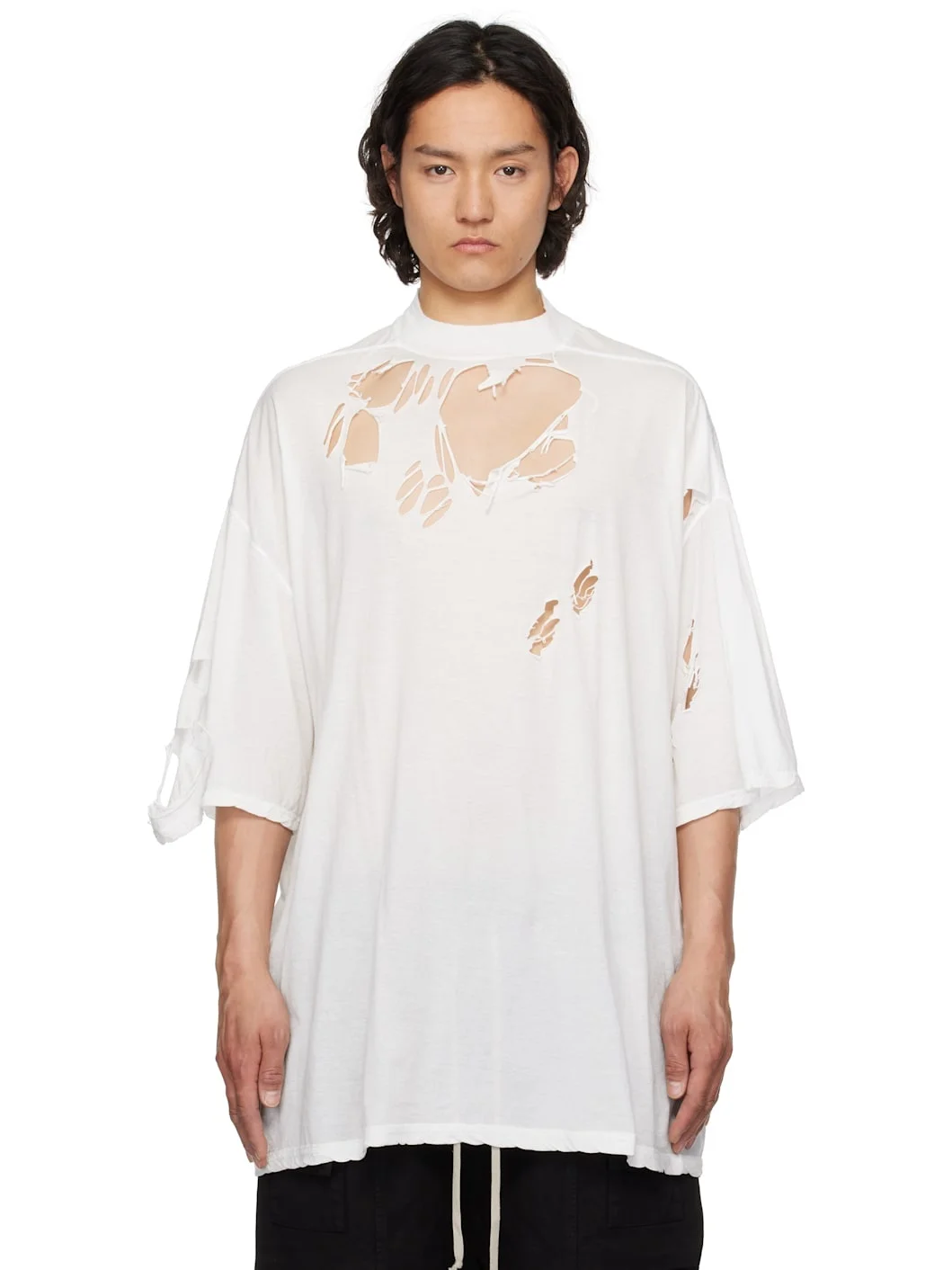 Lightweight GOTS-certified organic cotton gauze jersey T-shirt. Distressing throughout. · Oversized · Rib-knit crewneck · Dropped shoulders · Central seam at back · Integrated logo-woven strap at interior Supplier color: Milk 100% organic cotton. Made in Italy 251126M213032