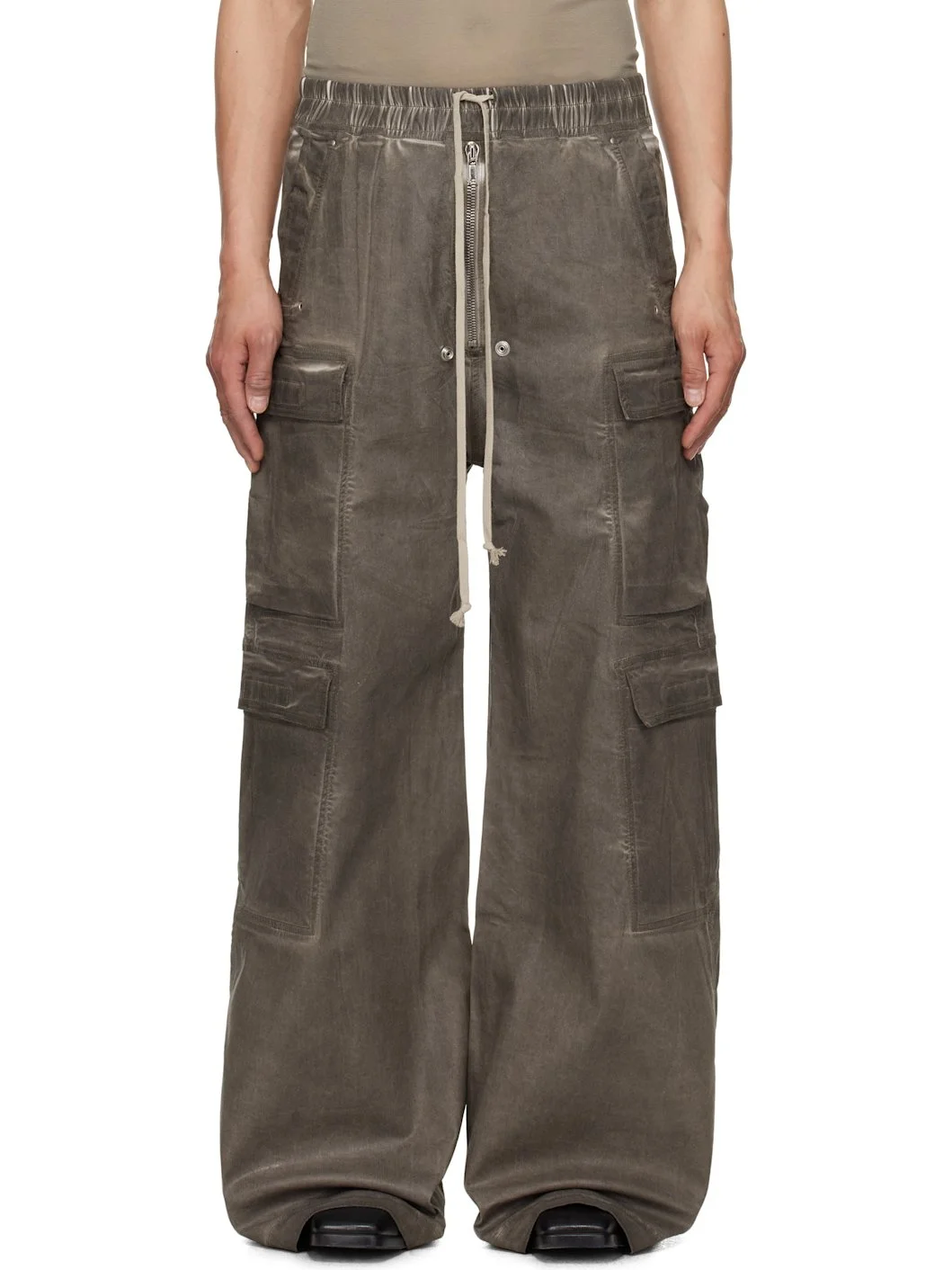 Overdyed and foil-coated stretch denim cargo pants. Fading throughout. · Wide-leg · Drawstring at elasticized waistband · Four-pocket styling · Exposed zip fly · Eyelets and rivets at front · Extended hem · Dropped inseam · Cargo pockets at outseams Supplier color: Darkdust Body: 90% cotton, 7% polyester, 3% rubber. Lining: 100% cotton. Made in Italy 251126M188022