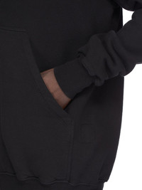 DRKSHDW FW25 CONCORDIANS JUMBO GIMP HOODIE IN BLACK SLUB FELPA THIS JUMBO GIMP HOODIE IS SLIGHTLY BELOW HIP LENGTH WITH LONG SLEEVES AND LARGE FIT. IT HAS A FRONT ZIPPER CLOSURE WITH EXPOSED ZIPPER TAPE THAT RUNS FROM THE HEM ALL THE WAY UP THROUGH THE HOOD, ALLOWING IT TO BE ZIPPERED COMPLETELY CLOSED OVER THE FACE. IT HAS TWO SIDE FRONT POCKETS, RIBBED CUFFS AND HEM AND A SINGLE SEAM RUNNING DOWN THE CENTRE BACK SPINE. THIS HEAVYWEIGHT COTTON SWEATSHIRT JERSEY IS MADE WITH A SLUB YARN AND HAS A SOFT AND WASHED HANDFEEL. THIS JERSEY IS GARMENT DYED THIS FABRIC IS MADE USING GOTS CERTIFIED ORGANIC COTTON WHICH MEANS THE NATURAL FIBER IS GROWN WITHOUT HARMFUL CHEMICALS, LEAVING OUR SOIL, AIR AND WATER CLEANER FROM CONTAMINATES COLOR: BLACK MATERIAL: 100% COTTON MODEL IS 189CM TALL MODEL WEARS SIZE S