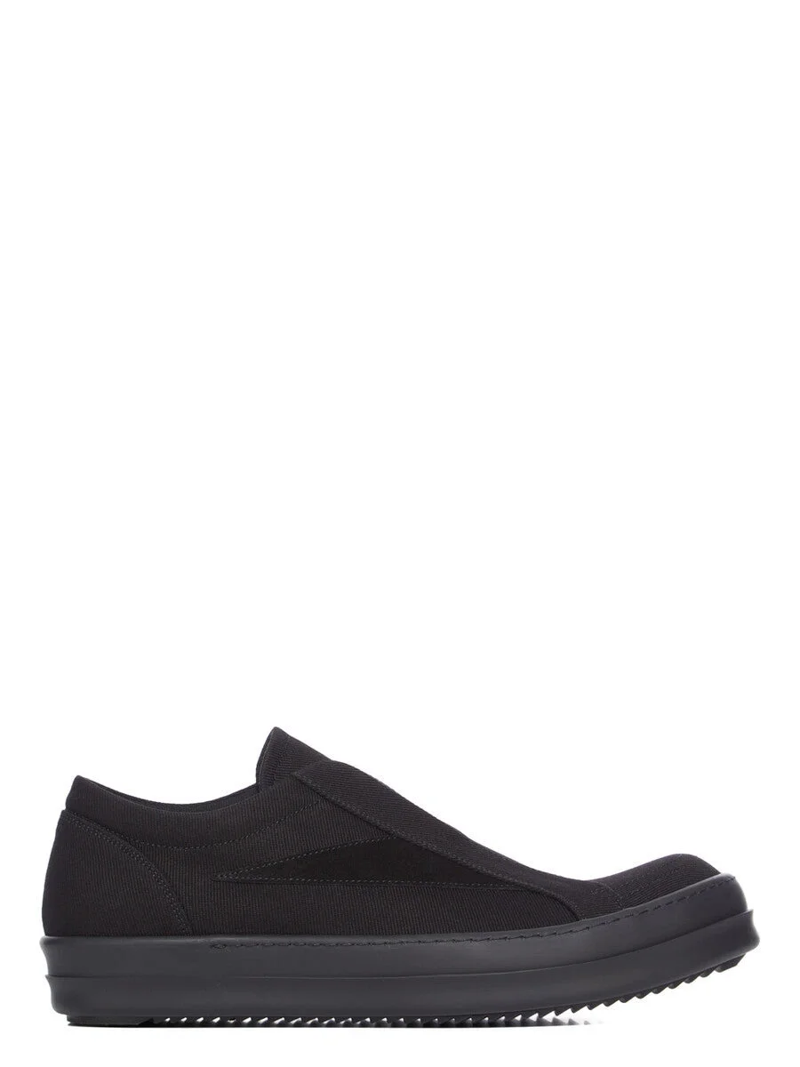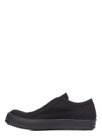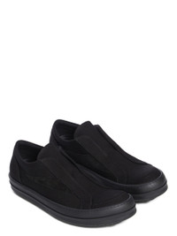 DRKSHDW SS26 TEMPLE LACELESS VINTAGE SNEAKS IN ALL BLACK 13OZ OVERDYED DENIM AND SUEDE LEATHER THESE LACELESS VINTAGE SNEAKS ARE UNDER-ANKLE HEIGHT SLIP-ONS AND HAVE SHARK TOOTH SOLES. THEY FEATURE A GRAPHIC LEATHER APPLIQUE ON THE SIDE FOOT AND CONTRAST STITCHING. THIS IS A COMBINATION OF 13OZ OVERDYED DENIM AND SUEDE LEATHER. THIS MEDIUMWEIGHT 13OZ DENIM IS OVERDYED AND HAS A SOFT AND WASHED HANDFEEL. THIS FABRIC IS MADE USING GOTS CERTIFIED ORGANIC COTTON WHICH MEANS THE NATURAL FIBER IS GROWN WITHOUT HARMFUL CHEMICALS, LEAVING OUR SOIL, AIR AND WATER CLEANER FROM CONTAMINATES. COLOR: ALL BLACK MATERIAL: UPPER 100% COTTON LATERAL DETAILS 100% CALF LEATHER LINING 100% COTTON SOLE 100% THERMOPLASTIC RUBBER SOLE HEIGHT 3.5CM