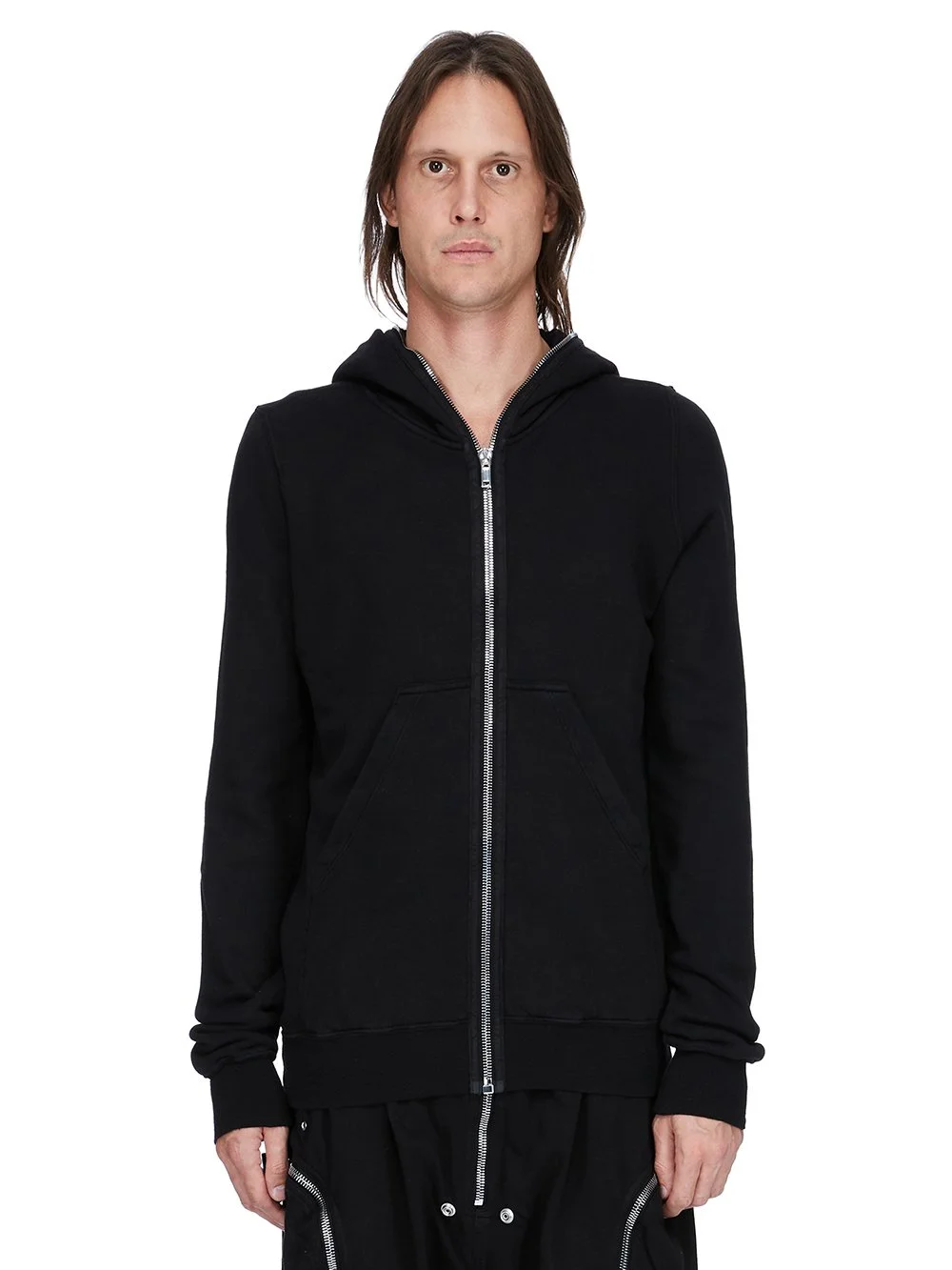DRKSHDW FW25 CONCORDIANS GIMP HOODIE IN BLACK SLUB FELPA THIS GIMP HOODIE IS HIP LENGTH WITH LONG SLEEVES. IT HAS A FRONT ZIPPER CLOSURE WITH EXPOSED ZIPPER TAPE THAT RUNS FROM THE HEM ALL THE WAY UP THROUGH THE HOOD, ALLOWING IT TO BE ZIPPERED COMPLETELY CLOSED OVER THE FACE. IT HAS TWO SIDE FRONT POCKETS, RIBBED CUFFS AND HEM AND A SINGLE SEAM RUNNING DOWN THE CENTRE BACK SPINE THIS HEAVYWEIGHT COTTON SWEATSHIRT JERSEY IS MADE WITH A SLUB YARN AND HAS A SOFT AND WASHED HANDFEEL. THIS JERSEY IS GARMENT DYED THIS FABRIC IS MADE USING GOTS CERTIFIED ORGANIC COTTON WHICH MEANS THE NATURAL FIBER IS GROWN WITHOUT HARMFUL CHEMICALS, LEAVING OUR SOIL, AIR AND WATER CLEANER FROM CONTAMINATES COLOR: BLACK MATERIAL: 99% COTTON 1% ELASTANE MODEL IS 189CM TALL MODEL WEARS SIZE S