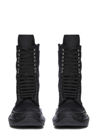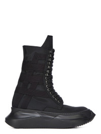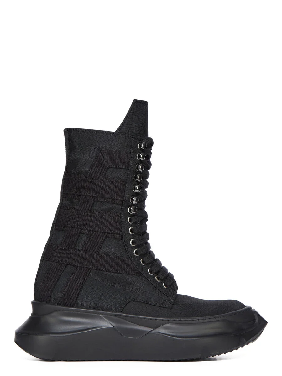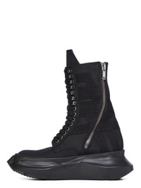 DRKSHDW SS26 TEMPLE LOW ARMY ABSTRACT IN ALL BLACK NYLON CANVAS THESE LOW ARMY ABSTRACT ARE ABOVE ANKLE HEIGHT. THEY HAVE FRONT LACES WITH EYELETS ON THE FOOT AND LACELETS AT THE ANKLE, AND A HIGH GEOMETRIC TONGUE. THEY FEATURE A VOLUMINOUS RUBBER ABSTRACT SOLE. THIS VERSION FEATURES A GEOMETRIC COTTON WEBBING STRIP MOTIVO. THIS MEDIUMWEIGHT NYLON CANVAS IS COMPACT WITH A CRISP AND TECHNICAL HANDFEEL. THIS FABRIC IS MADE USING GRS CERTIFIED RECYCLED NYLON WHICH ENSURES A REDUCTION IN WATER CONSUMPTION, EMISSIONS AND HAZARDOUS WASTE, LESSENING THE DEPENDENCE ON NON-RENEWABLE RESOURCES. COLOR: ALL BLACK MATERIAL: UPPER 100% NYLON LINING 100% COTTON MID SOLE 100% THERMOPLASTIC RUBBER SOLE 100% E.V.A