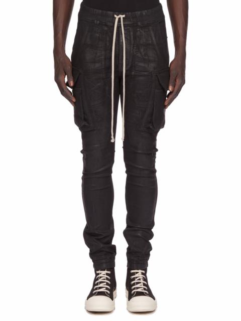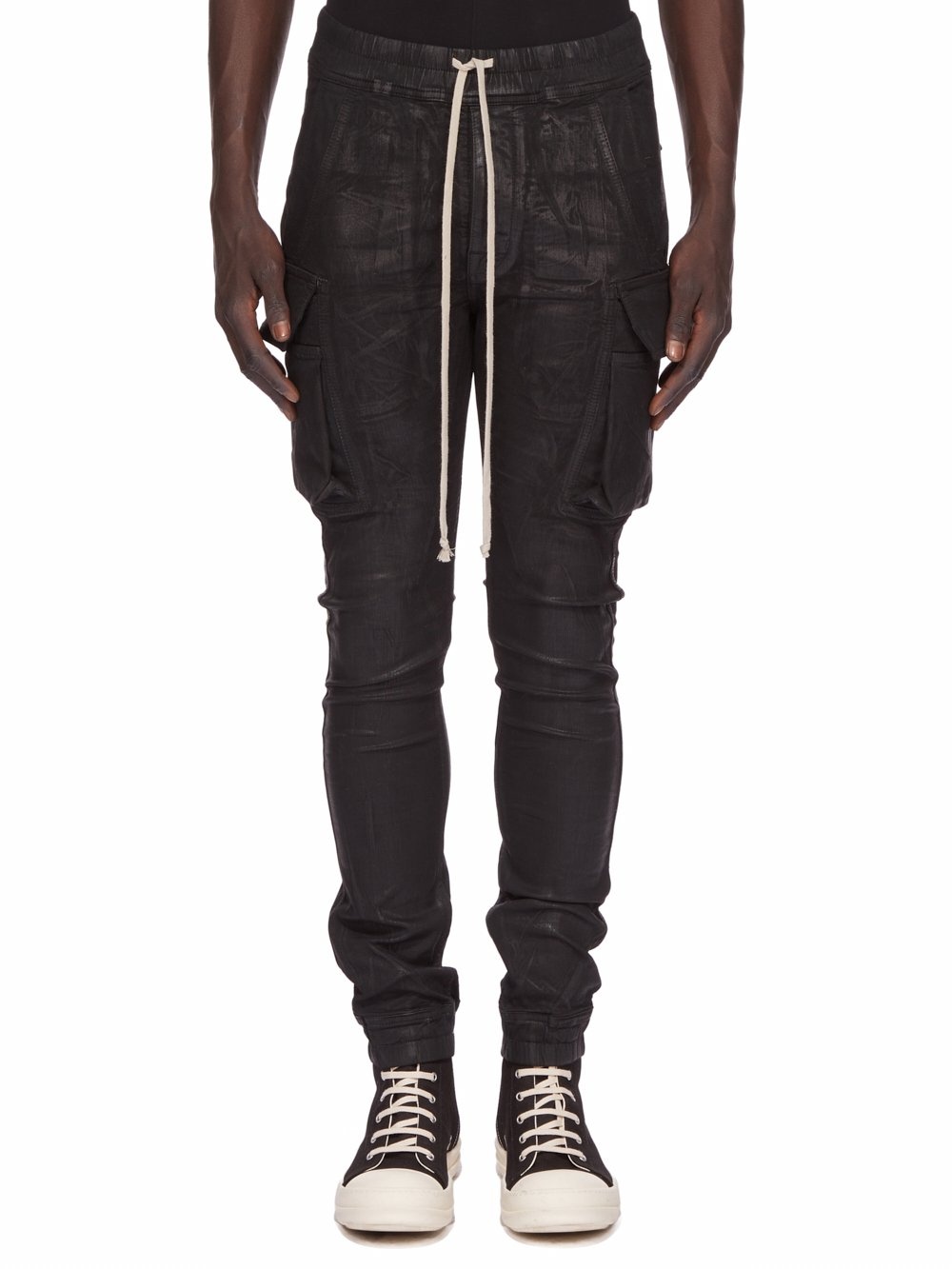 DRKSHDW SS25 HOLLYWOOD MASTODON CUT IN BLACK OVERDYED FOIL STRETCH DENIM THESE MASTODON CUT PANTS ARE FULL LENGTH WITH A SLIM FIT. THEY HAVE AN ELASTICIZED WAISTBAND WITH DRAWSTRING AND ELASTICIZED CUFFS. THEY FEATURE TWO SIDE WELT POCKETS, TWO ZIPPERED CARGO POCKETS WITH BEVELED FLAPS ON THE OUTER THIGH, AND BACK PATCH POCKETS WITH FLAPS AND TOPSTITCHING THIS LIGHTWEIGHT FOIL DENIM IS MADE ON A 10OZ STRETCH DENIM. THE READY GARMENT IS OVERDYED AND HAS A CLEAR, SEMI SHINY FOIL OVERLAY THAT CREATES A WAXY TOUCH SINCE THE FOIL IS PRESSED ON TOP OF THE FINAL GARMENTS, EACH PIECE WILL HAVE ITS OWN UNIQUE LOOK AND CREASES SINCE THE FOIL WILL ATTACH TO DIFFERENT PLACES DEPENDING ON THE GARMENT THIS GARMENT IS TREATED IN AN ITALIAN WASH HOUSE BASED IN THE VENETO AREA OF ITALY, THAT PRODUCES IN SMALLER TREATMENT BATHS TO REDUCE WATER WASTE AND UTILIZE A WATER PURIFYING PROCESS THAT ENABLES THEM TO RECYCLE A PORTION OF THE WATER USED. ALL OF OUR DENIM WASHES ARE ZDHC CERTIFIED. COLOR: BLACK MATERIAL: 90% COTTON + 7% POLYESTER + 3% RUBBER POCKETS LINING 100% COTTON MODEL IS 189CM TALL MODEL WEARS SIZE S