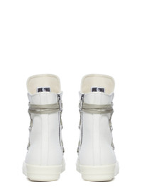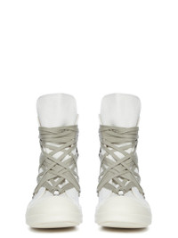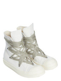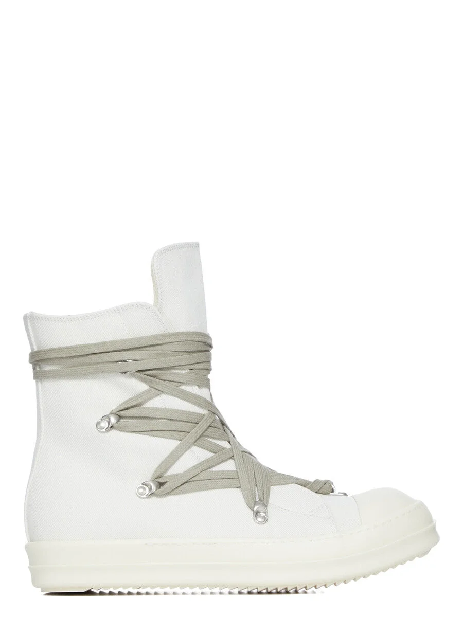 DRKSHDW SS26 TEMPLE MEGALACE SNEAKS IN CREAM/MILK/MILK 13OZ OVERDYED DENIM THESE MEGALACE® SNEAKS ARE ABOVE-ANKLE HEIGHT AND FEATURE SEVEN EYELETS, MEGALACE® DETAIL, A ZIPPER ON THE INSIDE ANKLE FOR EASY FASTENING, TOE CAPS AND SHARK TOOTH SOLES. THIS MEDIUMWEIGHT 13OZ DENIM IS OVERDYED AND HAS A SOFT AND WASHED HANDFEEL. THIS FABRIC IS MADE USING GOTS CERTIFIED ORGANIC COTTON WHICH MEANS THE NATURAL FIBER IS GROWN WITHOUT HARMFUL CHEMICALS, LEAVING OUR SOIL, AIR AND WATER CLEANER FROM CONTAMINATES. COLOR: CREAM/MILK/MILK MATERIAL:UPPER 100% COTTON TOE 70% POLYURETHANE + 30% VISCOSE LINING 100% COTTON SOLE 100% THERMOPLASTIC RUBBER SOLE HEIGHT 3.5CM