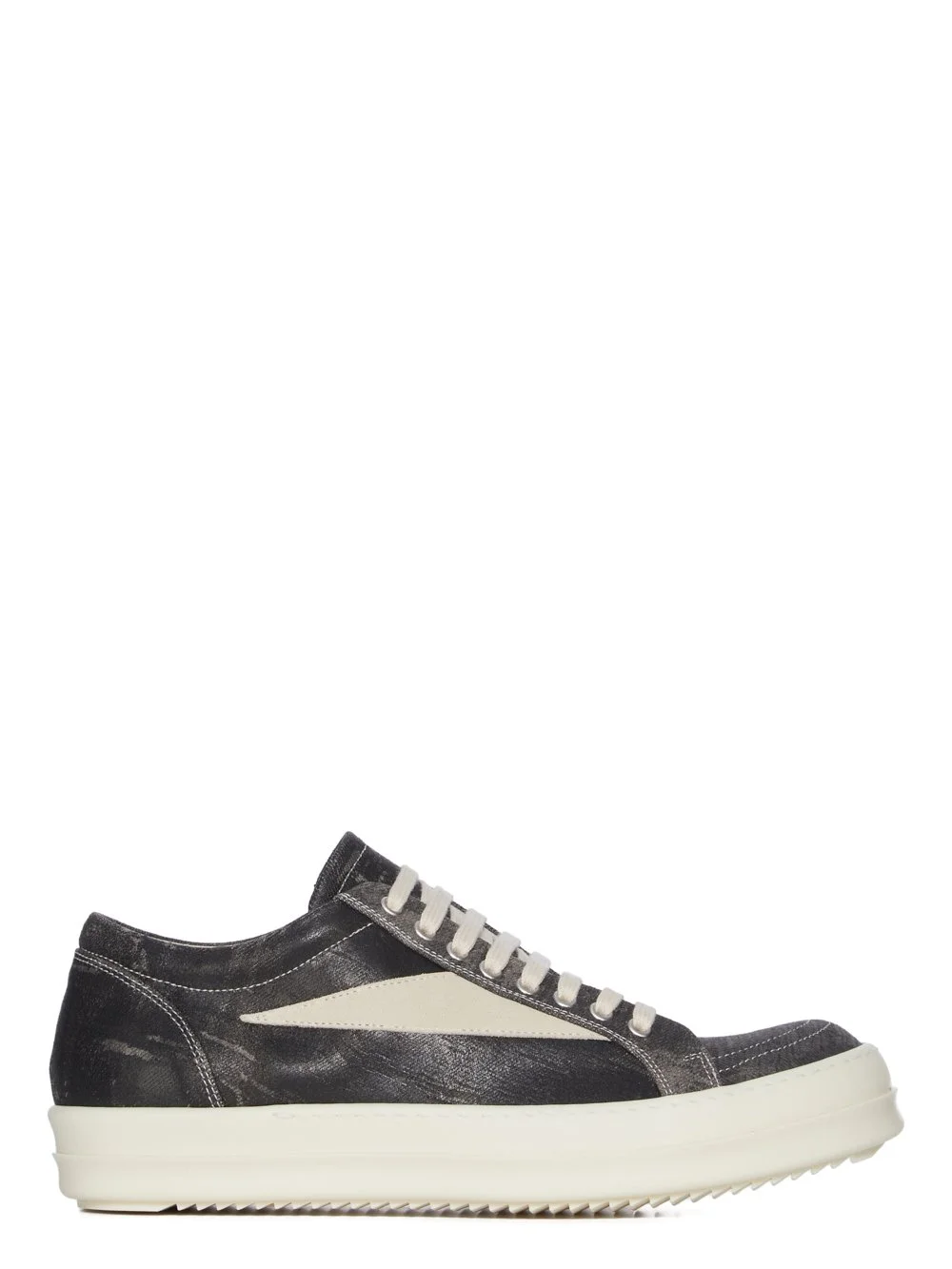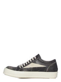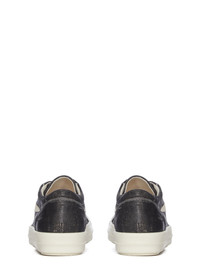 DRKSHDW FW25 CONCORDIANS VINTAGE SNEAKS IN SCAB WAX/MILK/MILK 13OZ SCAB WAX DENIM AND SUEDE LEATHER THESE VINTAGE SNEAKS ARE UNDER-ANKLE HEIGHT AND HAVE EIGHT EYELETS WITH LACES, TOE CAPS AND SHARK TOOTH SOLES.THEY FEATURE A GRAPHIC LEATHER APPLIQUE ON THE SIDE FOOT AND CONTRAST STITCHING. THIS IS A COMBINATION OF 13OZ SCAB WAX DENIM AND SUEDE LEATHER THIS MEDIUMWEIGHT SCAB WAX DENIM IS MADE ON A 13OZ INDIGO AND NATURAL DENIM. THE READY GARMENT IS OVERDYED SCAB AND TREATED WITH A WAX FINISH. A FINAL WASH GIVES THIS GARMENT ITS SOFTNESS THIS GARMENT IS TREATED IN AN ITALIAN WASH HOUSE BASED IN THE VENETO AREA OF ITALY, THAT PRODUCES IN SMALLER TREATMENT BATHS TO REDUCE WATER WASTE AND UTILIZE A WATER PURIFYING PROCESS THAT ENABLES THEM TO RECYCLE A PORTION OF THE WATER USED. ALL OF OUR DENIM WASHES ARE ZDHC CERTIFIED COLOR: SCAB WAX/MILK/MILK MATERIAL: UPPER 100% COTTON LATERAL DETAILS 100% CALF LEATHER LINING 100% COTTON SOLE HEIGHT 3.5CM