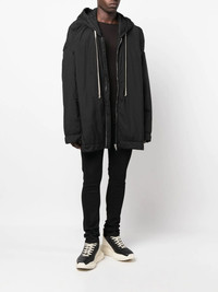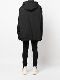 oversize drawstring raincoat black lightweight construction oversize frame drawstring hood front zip fastening long sleeves Made in Italy Composition Outer: Polyamide 100% Lining: Polyester 100% SIZE & FIT Model measurements Height 6 ft 0 in(1.84 m) Bust/Chest 35.82 in(91 cm) Hips 37 in(94 cm) Waist 28.34 in(72 cm) FittingInformation This piece fits true to size. We recommend you get your regular size Cut for a loose fit Made with a mid-weight non-stretch fabric Washing instructions Specialist Cleaning